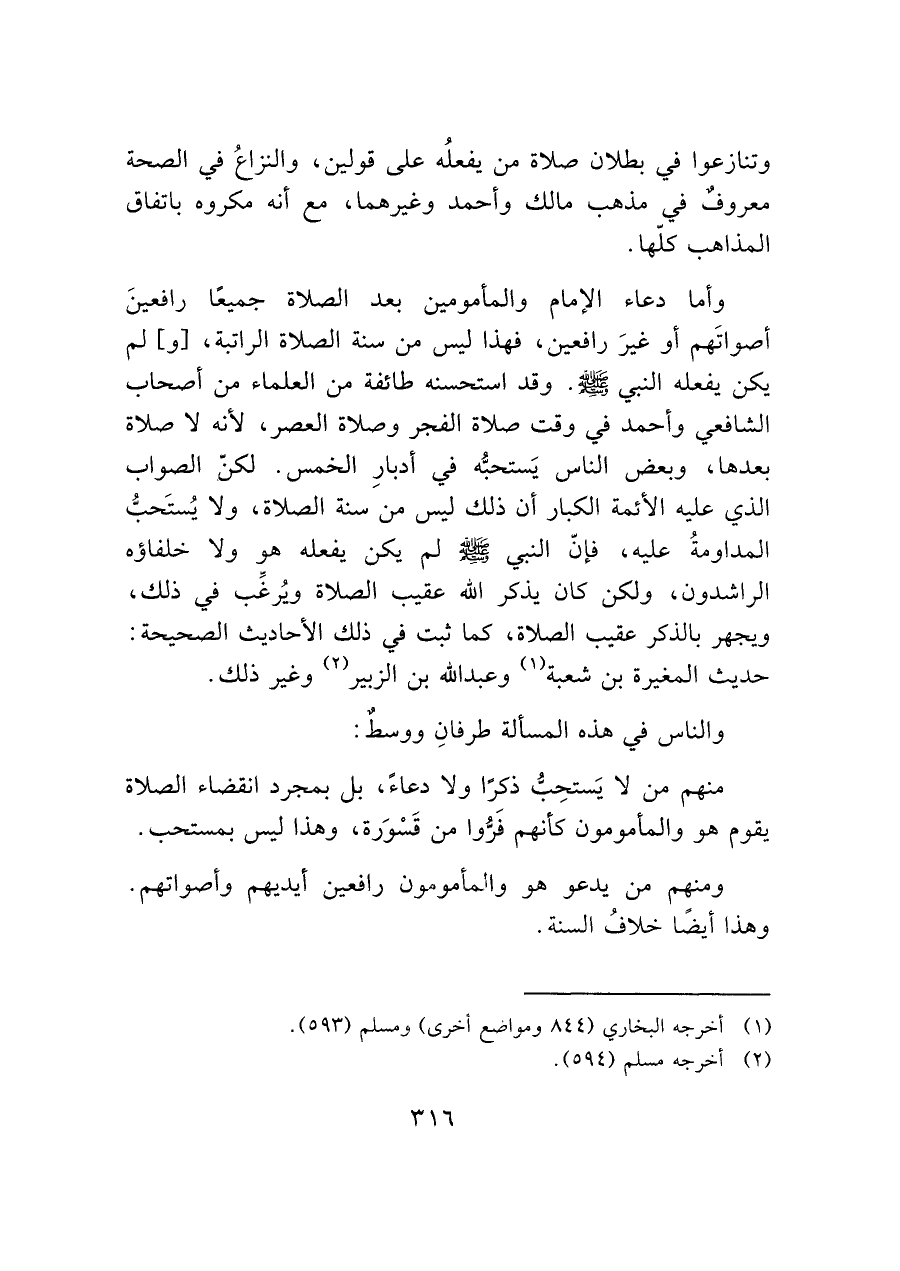 وأما في دعاء الإمام والمأمومين بعد الصلاة جميعًا رافعينَ أصواتَهم أو غيرَ رافعين، فهذا ليس من سنة الصلاة الراتبة، [و] لم يكن يفعله النبي - صَلَّى اللَّهُ عَلَيْهِ وَسَلَّمَ -. وقد استحسنه طائفة من العلماء من أصحاب الشافعي وأحمد في وقت صلاة الفجر وصلاة العصر، لأنه لا صلاة بعدها، وبعض الناس يستحبُّه في أدبارِ الخمس. لكنّ الصواب الذي عليه الأئمة الكبار أن ذلك ليس من سنة الصلاة، ولا يُستحبُّ المداومةُ عليه، فإنّ النبي - صَلَّى اللَّهُ عَلَيْهِ وَسَلَّمَ - لم يكن يفعله هو ولا خلفاؤه الراشدون، ولكن كان يذكر الله عقيب الصلاة ويُرغَب في ذلك، ويجهر بالذكر عقيب الصلاة، كما ثبت في ذلك الأحاديث الصحيحة: حديث المغيرة بن شعبة (¬١) وعبد الله بن الزبير (¬٢) وغير ذلك.