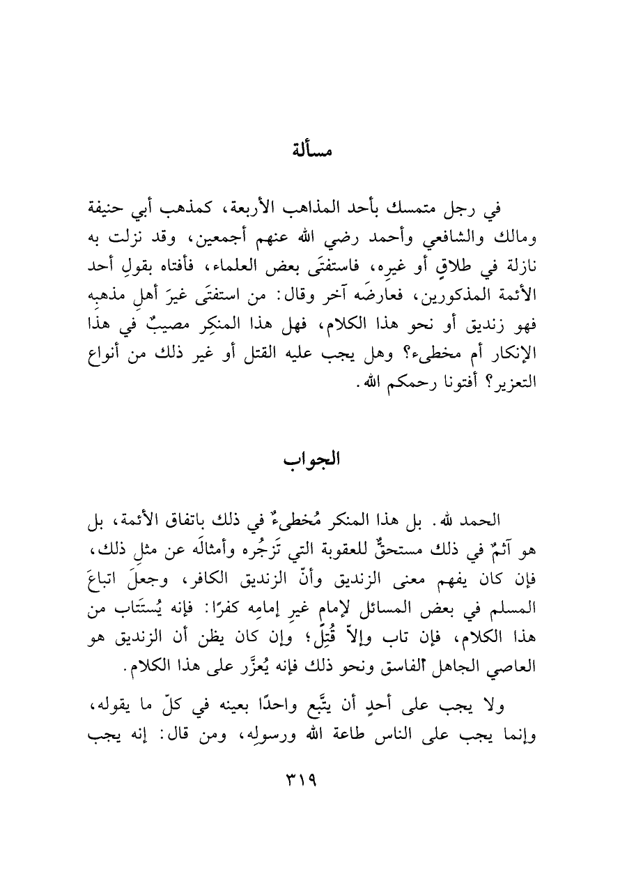 الحمد لله. بل هذا المنكر مُخطئ في ذلك باتفاق الأئمة، بل هو آثمٌ في ذلك مستحق للعقوبة التي تَزجُره وأمثالَه عن مثلِ ذلك، فإن كان يفهم معنى الزنديق وأنّ الزنديق الكافر، وجعلَ اتباعَ المسلم في بعض المسائل لإمامٍ غيرِ إمامِه كفرًا: فإنه يُستَتاب من هذا الكلام، فإن تاب وإلاّ قُتِل؟ وإن كان يظن أن الزنديق هو العاصي الجاهل الفاسق ونحو ذلك فإنه يُعزر على هذا الكلام.
