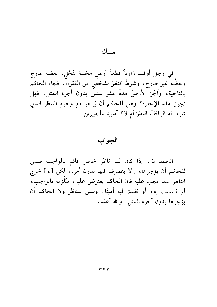 في رجل أوقف زاويةً قطعةَ أرضٍ مخللة بنَخْل، بعضه طازج وبعضُه غير طازج، وشرطَ النظرَ لشخصٍ من الفقراء، فجاء الحاكم بالناحية، واَجَرَ الأرضَ مدةَ عشر سنين بدون أجرة المثل. فهل تجوز هذه الإجارة؟ وهل للحاكم أن يُؤجر مع وجودِ الناظر الذي شرط له الواقفُ النظرَ أم لا؟ أفتونا مأجورين.