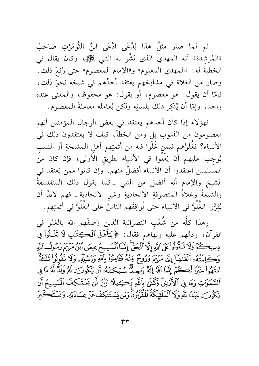 وهذا كلُه من شُعَب النصرانية الذين وَصفَهم الله بالغلو في القرآن، وذمَّهم عليه ونهَاهم فقال: (يَا أَهْلَ الْكِتَابِ لا تَغْلُوا فِي دِينِكُمْ وَلا تَقُولُوا عَلَى اللَّهِ إِلَّا الْحَقَّ إِنَّمَا الْمَسِيحُ عِيسَى ابْنُ مَرْيَمَ رَسُولُ اللَّهِ وَكَلِمَتُهُ أَلْقَاهَا إِلَى مَرْيَمَ وَرُوحٌ مِنْهُ فَآمِنُوا بِاللَّهِ وَرُسُلِهِ وَلا تَقُولُوا ثَلاثَةٌ انْتَهُوا خَيْراً لَكُمْ إِنَّمَا اللَّهُ إِلَهٌ وَاحِدٌ سُبْحَانَهُ أَنْ يَكُونَ لَهُ وَلَدٌ لَهُ مَا فِي السَّمَاوَاتِ وَمَا فِي الْأَرْضِ وَكَفَى بِاللَّهِ وَكِيلاً (١٧١) لَنْ يَسْتَنْكِفَ الْمَسِيحُ أَنْ يَكُونَ عَبْداً لله وَلا الْمَلائِكَةُ الْمُقَرَّبُونَ وَمَنْ يَسْتَنْكِفْ عَنْ عِبَادَتِهِ وَيَسْتَكْبِرْ