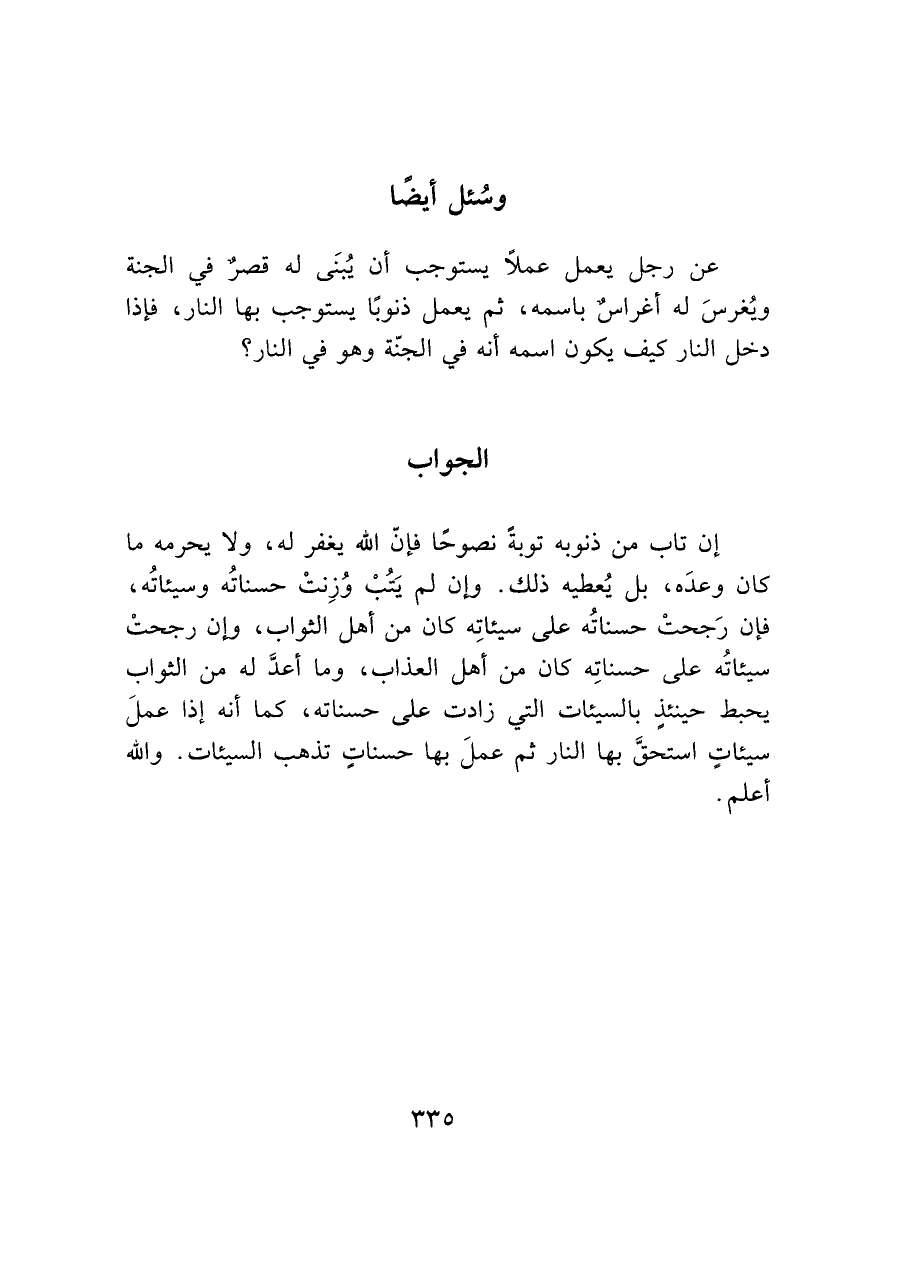 عن رجل يعمل عملاً يستوجب أن يُبنَى له قصر في الجنة ويُغرسَ له أغراس باسمه، ثم يعمل ذنوبًا يستوجب بها النار، فإذا دخل النار كيف يكون اسمه أنه في الجنّة وهو في النار؟