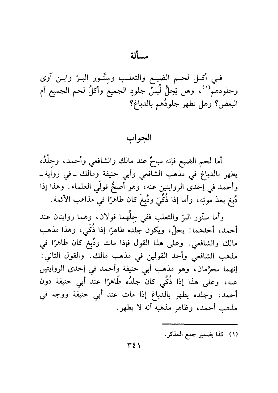 وأما سنّور البرّ والثعلب ففي حِلِّهما قولان، وهما روايتان عند أحمد، أحدهما: يحل، ويكون جلده طاهرًا إذا ذُكّي، وهذا مذهب مالك والشافعي. وعلى هذا القول فإذا مات ودُبغ كان طاهرًا في مذهب الشافعي وأحد القولين في مذهب مالك. والقول الثاني: إنهما محرَّمان، وهو مذهب أبي حنيفة وأحمد في إحدى الروايتين عنه، وعلى هذا إذا ذُكّي كان جلدُه طاهرًا عند أبي حنيفة دون أحمد، وجلده يطهر بالدباغ إذا مات عند أبي حنيفة ووجه في مذهب أحمد، وظاهر مذهبه أنه لا يطهر.