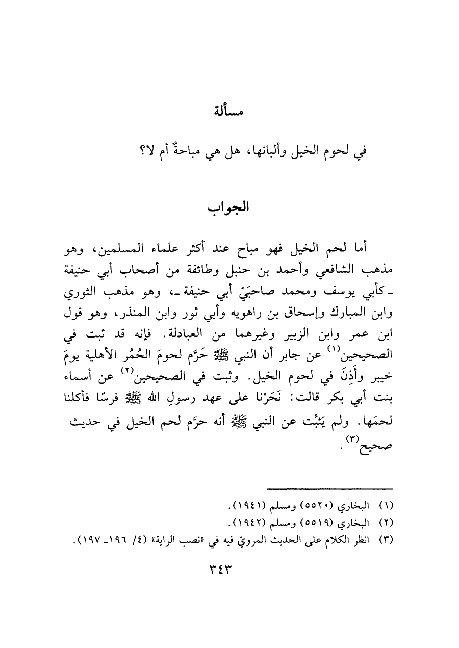 أما لحم الخيل فهو مباح عند أكثر علماء المسلمين، وهو مذهب الشافعي وأحمد بن حنبل وطائفة من أصحاب أبي حنيفة -كأبي يوسف ومحمد صاحبَيْ أبي حنيفة-، وهو مذهب الثوري وابن المبارك وإسحاق بن راهويه وأبي ثور وابن المنذر، وهو قول ابن عمر وابن الزبير وغيرهما من العبادلة. فإنه قد ثبت في الصحيحين (¬١) عن جابر أن النبي - صَلَّى اللَّهُ عَلَيْهِ وَسَلَّمَ - حَرَّم لحومَ الحُمُر الأهلية يومَ خيبر وأَذِنَ في لحوم الخيل. وثبت في الصحيحين (¬٢) عن أسماء بنت أبي بكر قالت: نَحَرْنا على عهد رسولِ الله - صَلَّى اللَّهُ عَلَيْهِ وَسَلَّمَ - فرسًا فأكلنا لحمَها. ولم يثبُت عن النبي - صَلَّى اللَّهُ عَلَيْهِ وَسَلَّمَ - أنه حرَّم لحم الخيل في حديث صحيح (¬٣).
