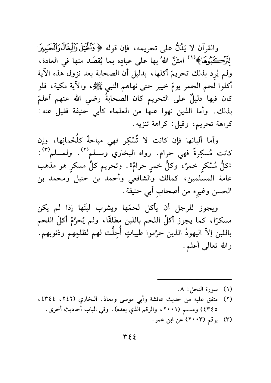 وأما ألبانها فإن كانت لا تُسْكِر فهي مباحةٌ كلُحْمانِها، وإن كانت مُسكِرةً فهي حرام. رواه البخاري ومسلم (¬٢). ولمسلم (¬٣): "كلُّ مُسْكرٍ خمرٌ، وكلُّ خمرٍ حرامٌ". وتحريم كلِّ مسكرٍ هو مذهب عامة المسلمين، كمالك والشافعي وأحمد بن حنبل ومحمد بن الحسن وغيرِه من أصحابِ أبي حنيفة.