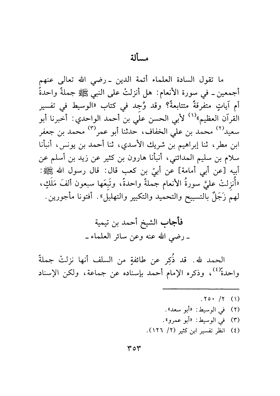 ما تقول السادة العلماء أئمة الدين -رضي الله تعالى عنهمٍ أجمعين- في سورة الأنعام: هل أنزلتْ على النبي - صَلَّى اللَّهُ عَلَيْهِ وَسَلَّمَ - جملةً واحدة أم آياتٍ متفرقةً متتابعةً؟ وقد وُجد في كتاب "الوسيط في تفسير القرآن العظيم" (¬١) لأبي الحسن علي بن أحمد الواحدي: أخبرنا أبو سعيد (¬٢) محمد بن علي الخفاف، حدثنا أبو عمر (¬٣) محمد بن جعفر ابن مطر، ثنا إبراهيم بن شريك الأسدي، ثنا أحمد بن يونس، أنبأنا سلام بن سليم المدائني، أنبانا هارون بن كثير عن زيد بن أسلم عن أبيه أعن أبي أمامة، عن أبي بن كعب قال: قال رسول الله - صَلَّى اللَّهُ عَلَيْهِ وَسَلَّمَ -: "أُنزِلتْ عليَّ سورةُ الأنعام جملةً واحدةً، وتَبعَها سبعون ألفَ مَلَكٍ، لهم زَجَلٌ بالتسبيح والتحميد والتكبير والتهليَل". أفتونا مأجورين.