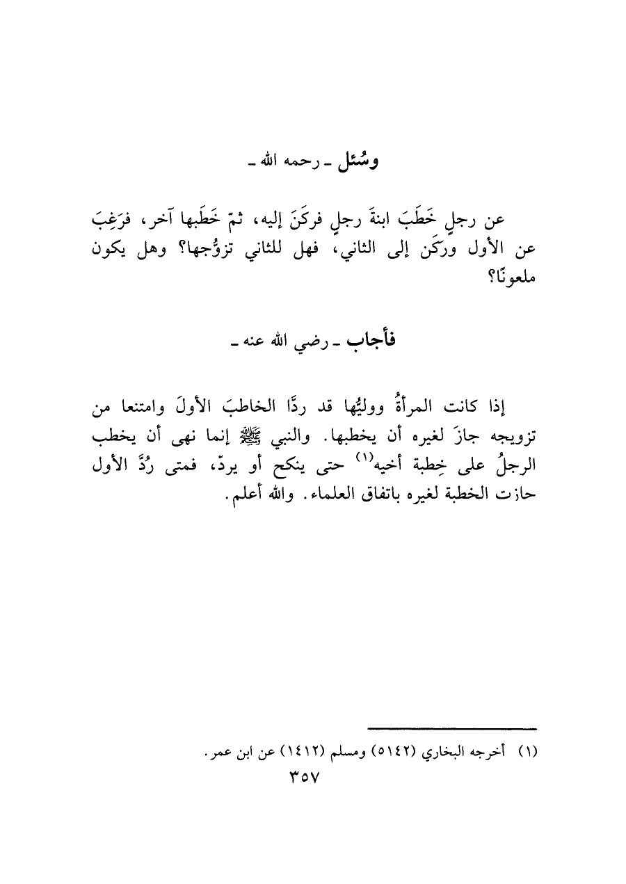 عن رجلٍ خَطَبَ ابنةَ رجلٍ فركَنَ إليه، ثمّ خَطَبها آخر، فرَغِبَ عن الأول وركَن إلى الثاني، فهل للثاني تزويجُها؟ وهل يكون ملعونًا؟