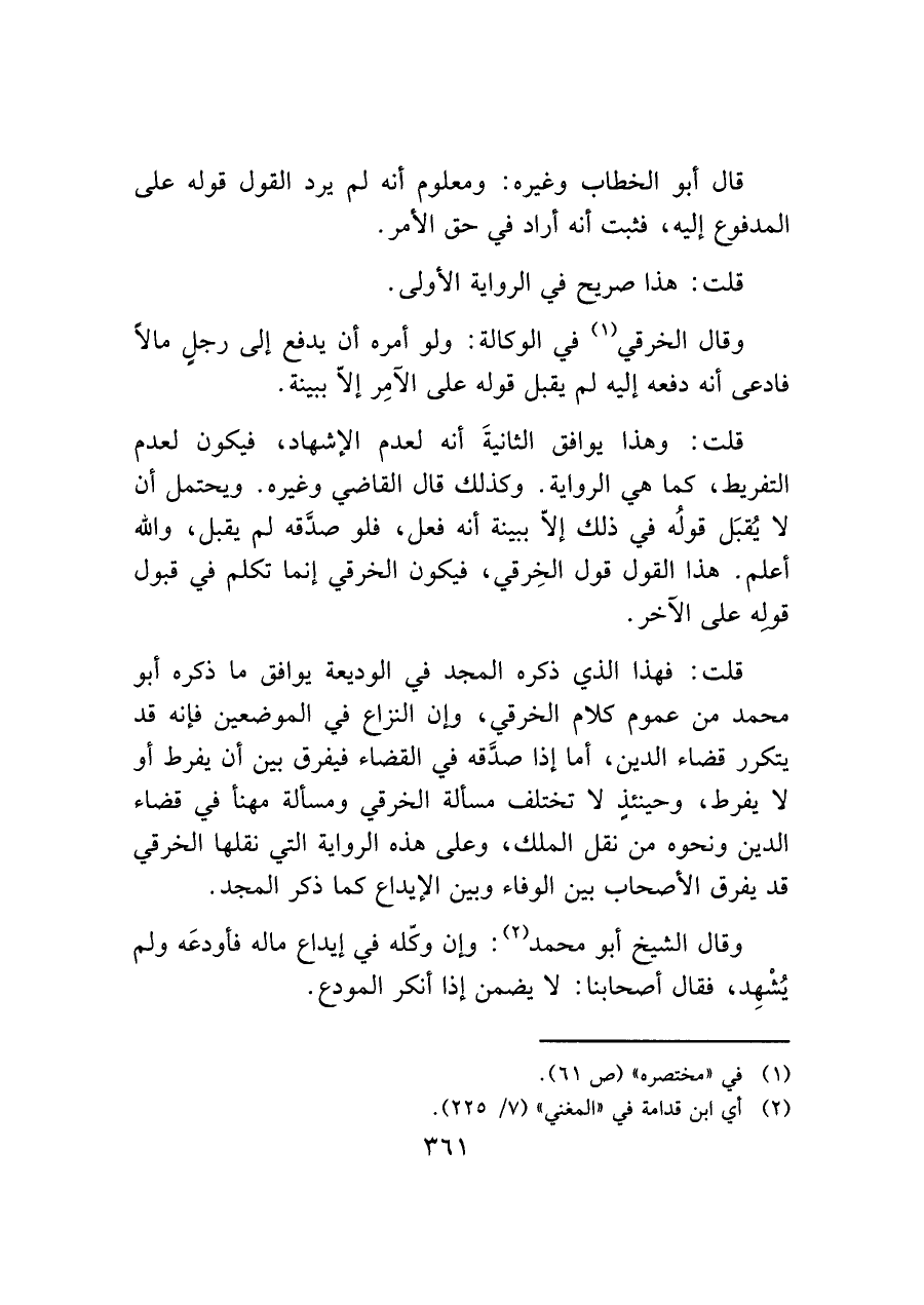 قلت: وهذا يوافق الثانيةَ أنه لعدم الإشهاد، فيكون لعدم التفريط، كما هي الرواية. وكذلك قال القاضي وغيره. ويحتمل أن لا يُقبَل قولُه في ذلك إلاّ ببينة أنه فعل، فلو صدَّقه لم يقبل، والله أعلم. هذا القول قول الخِرقي، فيكون الخرقي إنما تكلم في قبول قوله على الآخر.
