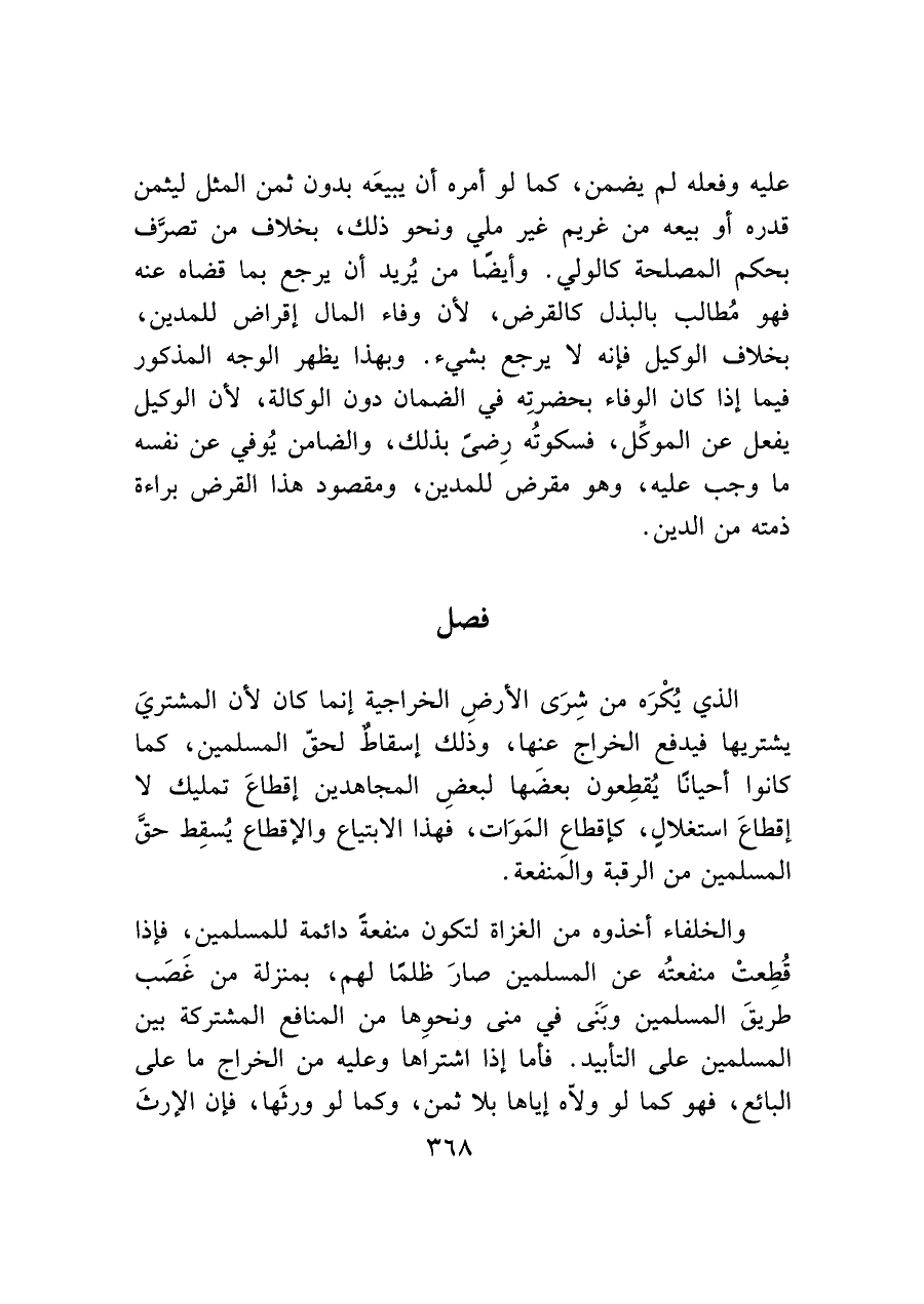 والخلفاء أخذوه من الغزاة لتكون منفعةً دائمة للمسلمين، فإذا قُطِعتْ منفعتُه عن المسلمين صارَ ظلمًا لهم، بمنزلة من غَصب طريقَ المسلمين وبَنَى في منى ونحوِها من المنافع المشتركة بين المسلمين على التأبيد. فأما إذا اشتراها وعليه من الخراج ما على البائع، فهو كما لو ولاّه إياها بلا ثمن، وكما لو ورثَها، فإن الإرثَ