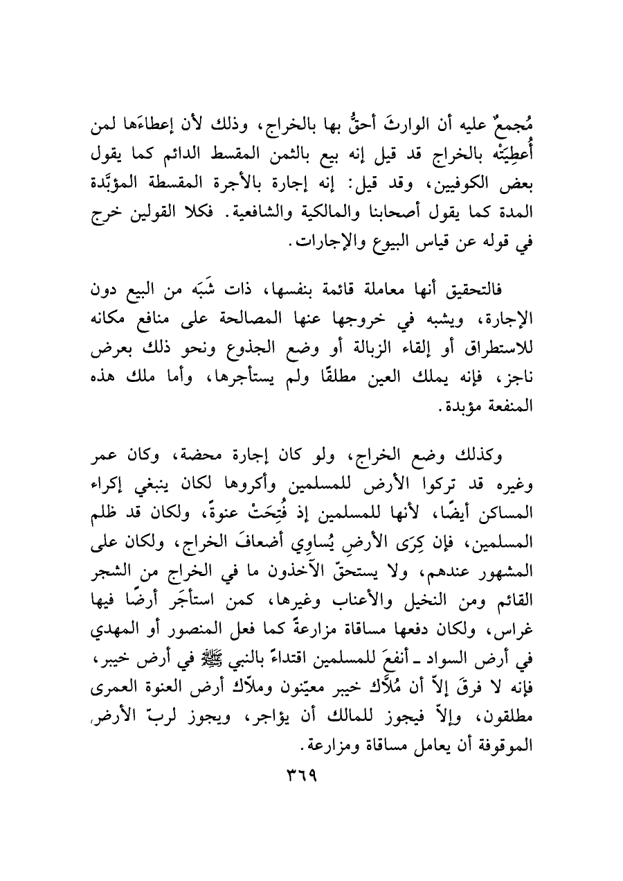 وكذلك وضع الخراج، ولو كان إجارة محضة، وكان عمر وغيره قد تركوا الأرض للمسلمين وأكروها لكان ينبغي إكراه المساكن أيضًا، لأنها للمسلمين إذ فُتِحَتْ عنوة، ولكان قد ظلم المسلمين، فإن كَرِى الأرضِ يُساوِي أضعافَ الخراج، ولكان على المشهور عندهم، ولا يستحق الآخذون ما في الخراج من الشجر القائم ومن النخيل والأعناب وغيرها، كمن استأجَر أرضًا فيها غراس، ولكان دفعها مساقاة مزارعةً كما فعل المنصور أو المهدي في أرض السواد -أنفعَ للمسلمين اقتداءً بالنبي - صَلَّى اللَّهُ عَلَيْهِ وَسَلَّمَ - في أرض خيبر، فإنه لا فرقَ إلاّ أن مُلَاّك خيبر معيّنون وملاّك أرض العنوة العمرى مطلقون، وإلاّ فيجوز للمالك أن يؤاجر، ويجوز لربّ الأرض الموقوفة أن يعامل مساقاة ومزارعة.