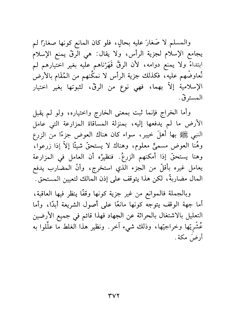 وبالجملة فالموانع من غير جزية كونها وقفا ينظر فيها العاقبة، أما جهة الوقف يتوجه كونها مانعًا على أصول الشريعة أبدًا، وأما التعليل بالاشتغال بالحراثة عن الجهاد فهذا قائم في جميع الأرضين عُشْرِيّها وخراجيّها، وذلك شيء آخر. ونظير هذا الغلط ما علَّلوا به أرضَ مكة.