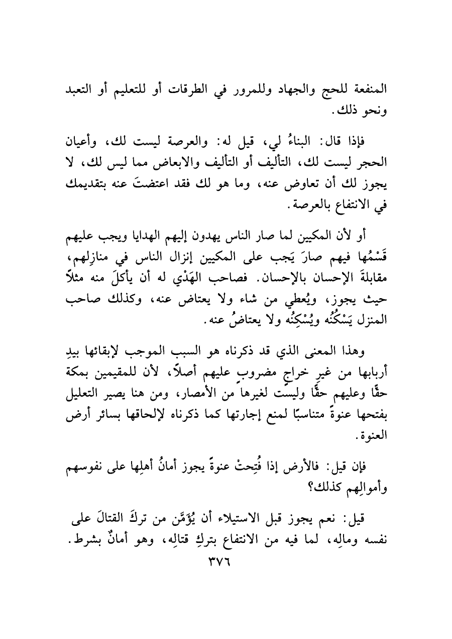 وهذا المعنى الذي قد ذكرناه هو السبب الموجب لإبقائها بيدِ أربابها من غيرِ خراجٍ مضروب عليهم أصلاً، لأن للمقيمين بمكة حقًّا وعليهم حقًّا وليست لغيرها من الأمصار، ومن هنا يصير التعليل بفتحها عنوةً متناسبًا لمنع إجارتها كما ذكرناه لإلحاقها بسائر أرض العنوة.