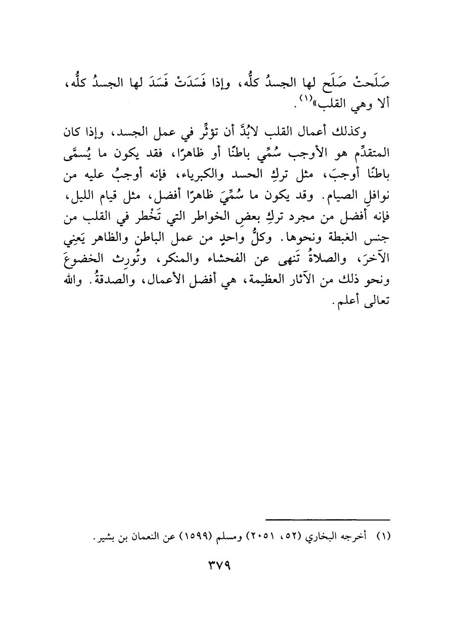 وكذلك أعمال القلب لابُد أن تؤثر في عمل الجسد، وإذا كان المتقدم هو الأوجب سُمي باطنًا أو ظاهرًا، فقد يكون ما يُسمَى باطنًا أوجبَ، مثل تركِ الحسد والكبرياء، فإنه أوجبُ عليه من نوافلِ الصيام. وقد يكون ما سُميَ ظاهرًا أفضل، مثل قيام الليل، فإنه أفضل من مجرد تركِ بعضِ الخواطر التي تَخْطر في القلب من جنس الغبطة ونحوها. وكل واحدٍ من عمل الباطن والظاهر يَعنِي الآخر، والصلاةُ تَنهى عن الفحشاء والمنكر، وتُورِث الخضوعَ ونحو ذلك من الآثار العظيمة، هي أفضل الأعمال، والصدقةُ. والله تعالى أعلم.