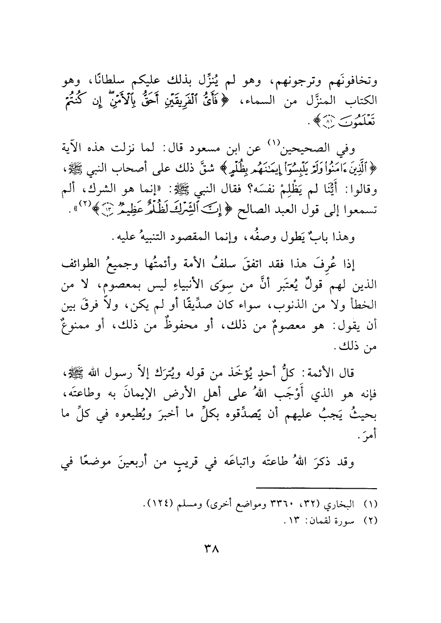 وفي الصحيحين (¬١) عن ابن مسعود قال: لما نزلت هذه الآية (الذين أمنوا ولم يلبسوا إيمانهم بظلم) شق ذلك على أصحاب النبي - صَلَّى اللَّهُ عَلَيْهِ وَسَلَّمَ - وقالوا: أَيُّنَا لم يَظْلِمْ نفسَه؟ فقال النبي - صَلَّى اللَّهُ عَلَيْهِ وَسَلَّمَ -: "إنما هو الشرك، ألم تسمعوا إلى قول العبد الصالح (إِنَّ الشركَ لَظلم عظيم (١٣)) (¬٢) ".