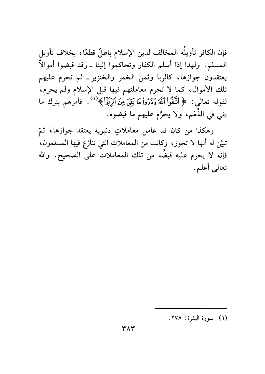فإن الكافر تأويلُه المخالف لدين الإسلام باطل قطعًا، بخلاف تأويل المسلم. ولهذا إذا أسلم الكفار وتحاكموا إلينا- وقد قبضوا أموالاً يعتقدون جوازها، كالربى وثمن الخمر والخنزير- لم تحرم عليهم تلك الأموال، كما لا تحرم معاملتهم فيها قبل الإسلام ولم يحرم، لقوله تعالى: (اتَّقُوا اللَّهَ وَذَرُوا مَا بَقِيَ مِنَ الرِّبا) (¬١). فأمرهم بترك ما بقي في الذمَم، ولا يحرِّم عليهم ما قبضوه.