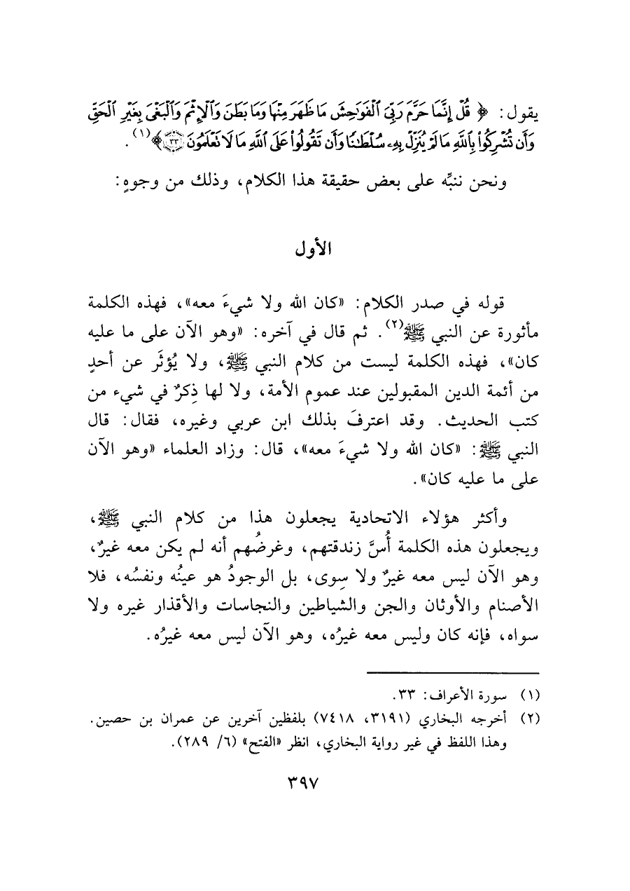 وأكثر هؤلاء الاتحادية يجعلون هذا من كلام النبي - صَلَّى اللَّهُ عَلَيْهِ وَسَلَّمَ -، ويجعلون هذه الكلمة أُسَّ زندقتهم، وغرضُهم أنه لم يكن معه غير، وهو الآن ليس معه غير ولا سِوى، بل الوجودُ هو عينُه ونفسُه، فلا الأصنام والأوثان والجن والشياطين والنجاسات والأقذار غيره ولا سواه، فإنه كان وليس معه غيرُه، وهو الآن ليس معه غيرُه.