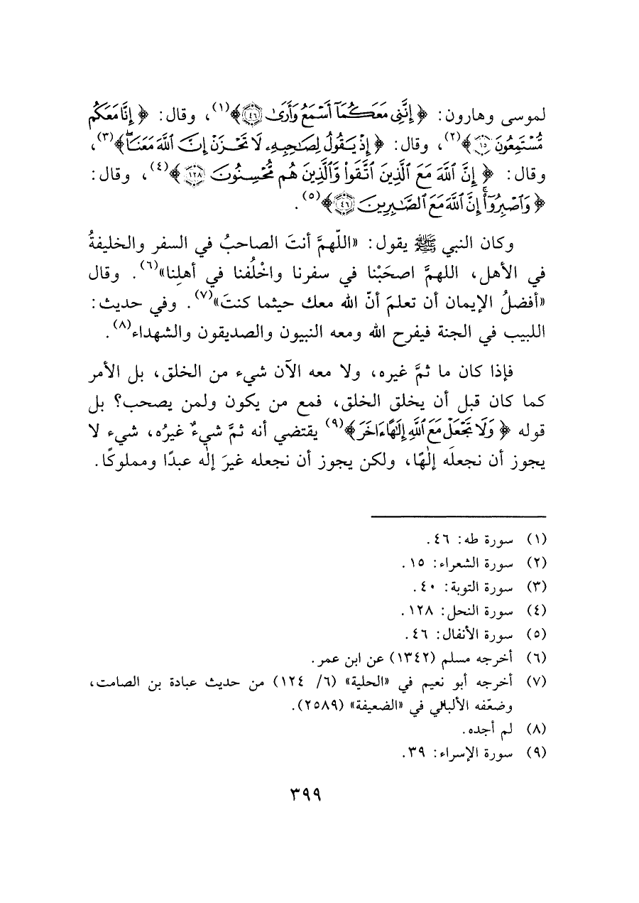 لموسى وهارون: (إننى معكما أسمع وأرى (٤٦)) (¬١)، وقال: (إنا معكم مستمعون (١٥)) (¬٢)، وقال: (إِذْ يَقُولُ لِصَاحِبِهِ لا تَحْزَنْ إِنَّ اللَّهَ مَعَنَا (٤٠)) (¬٣)،َ وقال: (إِنَّ اللَّهَ مَعَ الَّذِينَ اتَّقَوْا وَالَّذِينَ هُمْ مُحْسِنُونَ (١٢٨)) (¬٤)، وقال: (واصبروا عن الله مع الصابرين (٤٦)) (¬٥).
