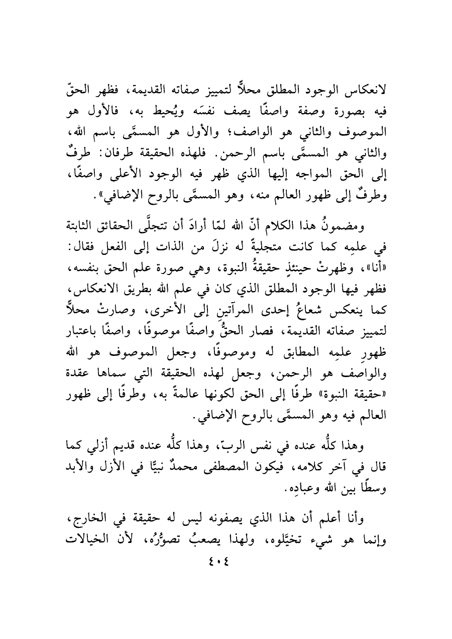 ومضمونُ هذا الكلام أنّ الله لما أرادَ أن تتجلَّى الحقائق الثابتة في علمِه كما كانت متجلية له نزلَ من الذات إلى الفعل فقال: "أنا"، وظهرتْ حينئذ حقيقةُ النبوة، وهي صورة علم الحق بنفسه، فظهر فيها الوجود المطلق الذي كان في علم الله بطريق الانعكاس، كما ينعكس شعاعُ أحد المرآتينِ إلى الأخرى، وصارتْ محلاًّ لتمييز صفاته القديمة، فصار الحقُّ واصفًا موصوفًا، واصفًا باعتبار ظهورِ علمِه المطابق له وموصوفًا، وجعل الموصوف هو الله والواصف هو الرحمن، وجعل لهذه الحقيقة التي سماها عقدة "حقيقة النبوة" طرفًا إلى الحق لكونها عالمةً به، وطرفا إلى ظهور العالم فيه وهو المسمَّى بالروح الإضافي.