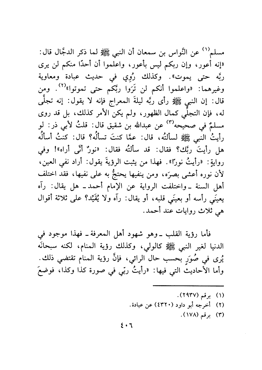 مسلم (¬١) عن النواس بن سمعان أن النبي - صَلَّى اللَّهُ عَلَيْهِ وَسَلَّمَ - لما ذكر الدجَّال قال: "إنه أعور، وإن ربكم ليس بأعور، واعلموا أن أحدًا منكم لن يرى ربَّه حتى يموت". وكذلك رُوِي في حديث عبادة ومعاوية وغيرهما: "واعلموا أنكم لن تَرَوا ربَّكم حتى تموتوا" (¬٢). ومن قال: إن النبي - صَلَّى اللَّهُ عَلَيْهِ وَسَلَّمَ - رأى ربه ليلةَ المعراج فإنه لا يقول: إنه تجلَّى له، فإن التجلي كمال الظهور، ولم يكن الأمر كذلك، بل قد روى مسلم في صحيحه (¬٣) عن عبد الله بن شقيق قال: قلتُ لأبي ذر: لو رأيتُ النبي - صَلَّى اللَّهُ عَلَيْهِ وَسَلَّمَ - لسألتُه، قال: عمَّا كنتَ تسألُه؟ قال: كنتُ أسألُه هل رأيتَ ربَّك؟ فقال: قد سألتُه فقال: "نور أنَّى أراه"! وفي رواية: "رأيتُ نورًا". فهذا من يثبت الرؤيةَ يقول: أراد نفي العين، لأن نوره أعشى بصرَه، ومن ينفيها يحتجُّ به على نفيها، فقد اختلف أهل السنة -واختلفت الرواية عن الإمام أحمد- هل يقال: رآه بعينَي رأسه أو بعينَي قلبه، أو يقال: رآه ولا يُقَيِّد؟ على ثلاثة أقوال هي ثلاث روايات عند أحمد.