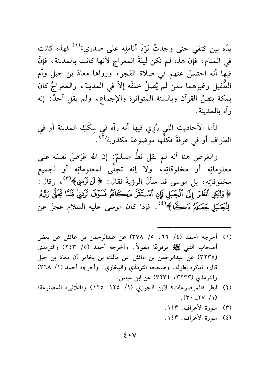 يدَه بين كتفي حتى وجدتُ بَرْدَ أناملِه على صدري" (¬١) فهذه كانت في المنام، فإن هذه لم تكن ليلةَ المعراج لأنها كانت بالمدينة، فإنّ فيها أنه احتبسَ عنهم في صلاة الفجر، ورواها معاذ بن جبل وأم الطُّفيل وغيرهما ممن لم يُصلِّ خلفَه إلاّ في المدينة، والمعراجُ كان بمكة بنصِّ القرآن وبالسنة المتواترة والإجماع، ولم يقل أحدٌ: إنه رآه بالمدينة.