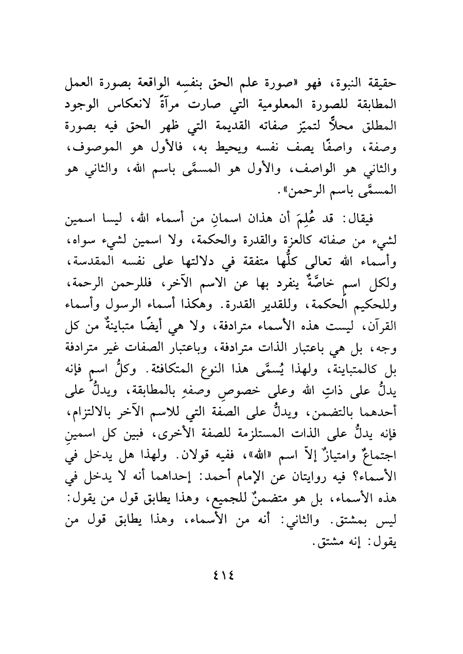 فيقال: قد عُلِمَ أن هذان اسمانِ من أسماء الله، ليسا اسمين لشيء من صفاته كالعزة والقدرة والحكمة، ولا اسمين لشيء سواه، وأسماء الله تعالى كلُّها متفقة في دلالتها على نفسه المقدسة، ولكل اسمٍ خاصَّةٌ ينفرد بها عن الاسم الآخر، فللرحمن الرحمة، وللحكيم الحكمة، وللقدير القدرة. وهكذا أسماء الرسول وأسماء القرآن، ليست هذه الأسماء مترادفة، ولا هي أيضًا متباينةٌ من كل وجه، بل هي باعتبار الذات مترادفة، وباعتبار الصفات غير مترادفة بل كالمتباينة، ولهذا يُسمى هذا النوع المتكافئة. وكلُّ اسمٍ فإنه يدلُّ على ذاتِ الله وعلى خصوصِ وصفهِ بالمطابقة، ويدلُّ على أحدهما بالتضمن، ويدلُّ على الصفة التي للاسم الآخر بالالتزام، فإنه يدلُّ على الذات المستلزمة للصفة الأخرى، فبين كل اسمينِ اجتماعٌ وامتيازٌ إلاّ اسم "الله"، ففيه قولان. ولهذا هل يدخل في الأسماء؟ فيه روايتان عن الإمام أحمد: إحداهما أنه لا يدخل في هذه الأسماء، بل هو متضمنٌ للجميع، وهذا يطابق قول من يقول: ليس بمشتق. والثاني: أنه من الأسماء، وهذا يطابق قول من يقول: إنه مشتق.