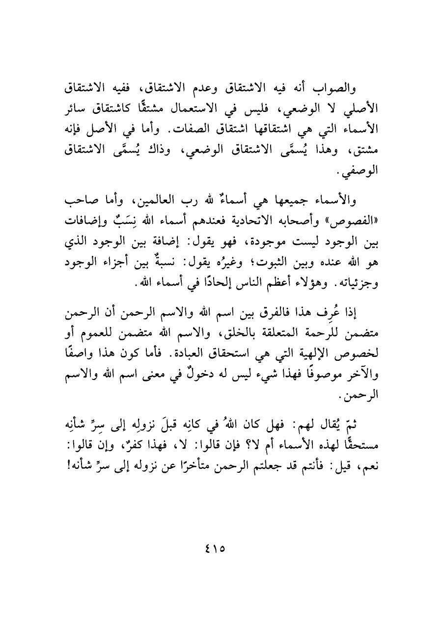 ثم يُقال لهم: فهل كان اللهُ في كانِه قبلَ نزولِه إلى سِرِّ شأنِه مستحقٌّ لهذه الأسماء أم لا؟ فإن قالوا: لا، فهذا كفرٌ، وإن قالوا: نعم، قيل: فأنتم قد جعلتم الرحمن متأخرا عن نزوله إلى سرِّ شأنه!