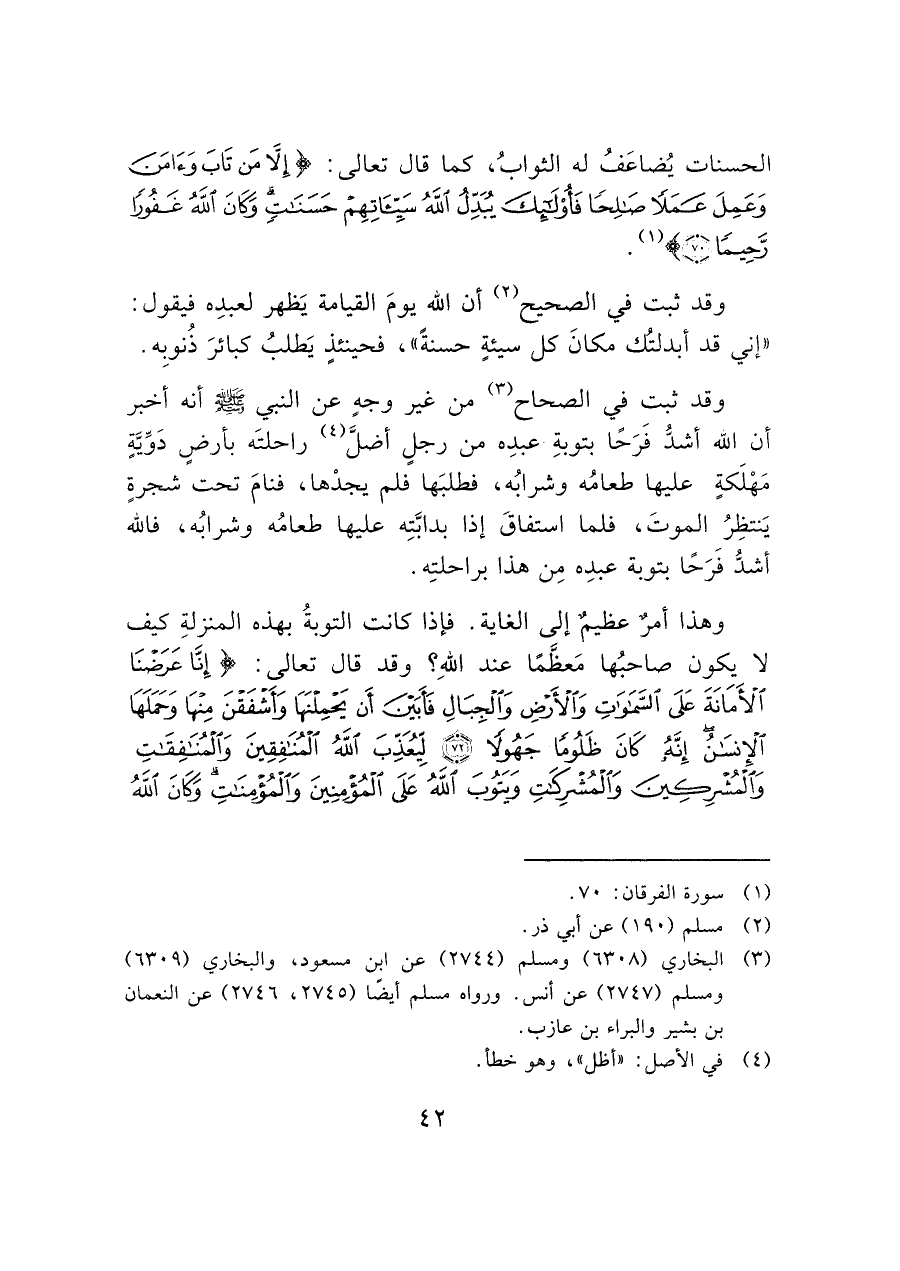 وهذا أمرٌ عظيمٌ إلى الغاية. فإذا كانت التوبةُ بهذه المنزلةِ كيف لا يكون صاحبُها مَعظَّمًا عند اللهِ؟ وقد قال تعالى: (إِنَّا عَرَضنَا الأَمَانَةَ عَلَى السماوات والأرض والجِبَالِ فَأَبَين أَن يحمِلنَهَا وَأَشفَقنَ مِنهَا وَحَملَها الإنسانُ إِنَّه كانَ ظَلُوما جَهُولا (٧٢) لِيَعُذبَ اللهُ اَلمُنافِقِينَ وَالمُناَفِقات وَالمشركين والمشركات ويتوب الله عَلَى اَلْمُؤمِنِينَ وَالمُؤمِنات وكَاَنَ الله