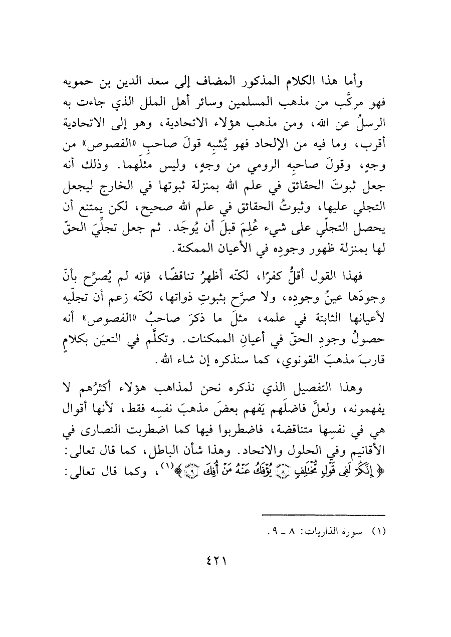 وأما هذا الكلام المذكور المضاف إلى سعد الدين بن حمويه فهو مركَب من مذهب المسلمين وسائر أهل الملل الذي جاءت به الرسلُ عن الله، ومن مذهب هؤلاء الاتحادية، وهو إلى الاتحادية أقرب، وما فيه من الإلحاد فهو يُشبِه قولَ صاحب "الفصوص" من وجهٍ، وقولَ صاحبِه الرومي من وجهٍ، وليس مَثلَهما. وذلك أنه جعل ثبوتَ الحقائق في علم الله بمنزلة ثبوتها في الخارج ليجعل التجلي عليها، وثبوتُ الحقائق في علم الله صحيح، لكن يمتنع أن يحصل التجلّي على شيء عُلِمَ قبلَ أن يُوجَد. ثم جعل تجلِّيَ الحقّ لها بمنزلة ظهور وجودِه في الأعيان الممكنة.