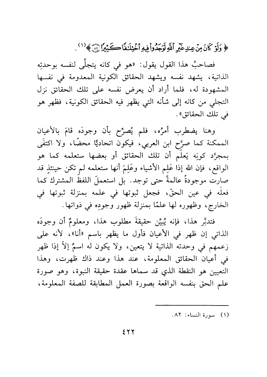 فتدبَّر هذا، فإنه يُبين حقيقةَ مطلوب هذا، ومعلومٌ أن وجودَه الذاتي إن ظهر في الأعيان فأول ما يظهر باسم "أنا"، لأنه على زعمهم في وحدته الذاتية لا يتعين، ولا يكون له اسمٌ إلاّ إذا ظهر في أعيان الحقائق المعلومة، عند هذا وعند ذاك ظهرت، وهذا التعيين هو النقطة الذي قد سماها عقدة حقيقة النبوة، وهو صورة علم الحق بنفسه الواقعة بصورة العمل المطابقة للصفة المعلومة،