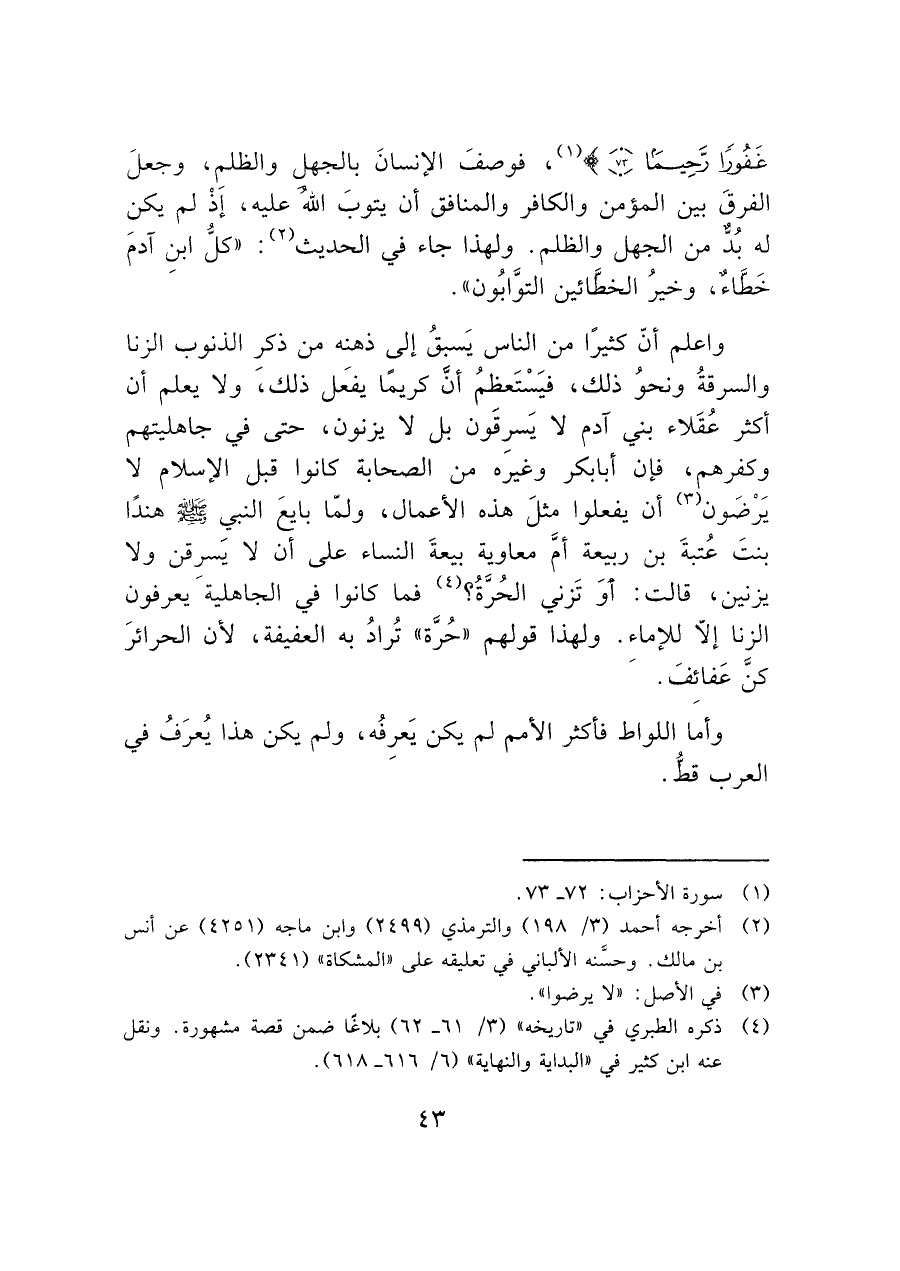 واعلم أن كثيرًا من الناس يَسبقُ إلى ذهنه من ذكر الذنوب الزنا والسرقةُ ونحوُ ذلك، فيَسْتَعظمُ أن كريمًا يفَعل ذلك، ولا يعلم أن أكثر عُقَلاء بني آدم لا يَسرِقَون بل لا يزنون، حتى في جاهليتهم وكفرهم، فإن أبا بكر وغيره من الصحابة كانوا قبل الإسلام لا يَرْضَون (¬٣) أن يفعلوا مثلَ هذه الأعمال، ولما بايعَ النبي - صَلَّى اللَّهُ عَلَيْهِ وَسَلَّمَ - هندًا بنتَ عُتبةَ بن ربيعة أمَّ معاوية بيعةَ النساء على أن لا يَسرقن ولا يزنين، قالت: أوَ تَزني الحُرَّةُ؟ (¬٤) فما كانوا في الجاهلية يعرفون الزنا إلاّ للإماء. ولهذا قولهم "حُرَّة" تُرادُ به العفيفة، لأن الحرائرَ كن عَفائِفَ.