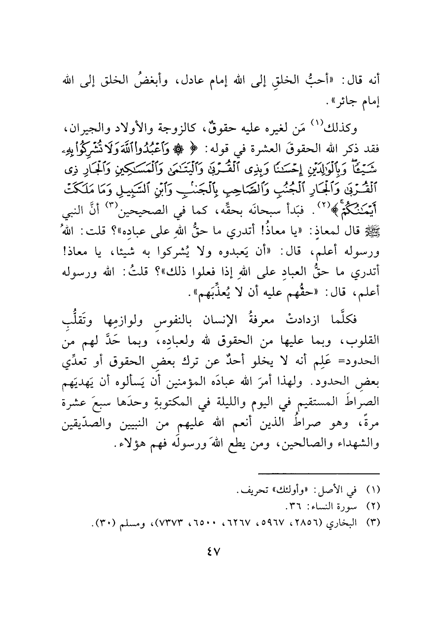 وكذلك (¬١) مَن لغيره عليه حقوقٌ، كالزوجة والأولاد والجيران، فقد ذكر الله الحقوقَ العشرة في قوله: (*وَاعْبُدُوا اللَّهَ وَلا تُشْرِكُوا بِهِ شَيْئاً وَبِالْوَالِدَيْنِ إِحْسَاناً وَبِذِي الْقُرْبَى وَالْيَتَامَى وَالْمَسَاكِينِ وَالْجَارِ ذِي الْقُرْبَى وَالْجَارِ الْجُنُبِ وَالصَّاحِبِ بِالْجَنْبِ وَابْنِ السَّبِيلِ وَمَا مَلَكَتْ أَيْمَانُكُمْ) (¬٢). فبَدأ سبحانَه بحقِّه، كما في الصحيحين (¬٣) أنَ النبي