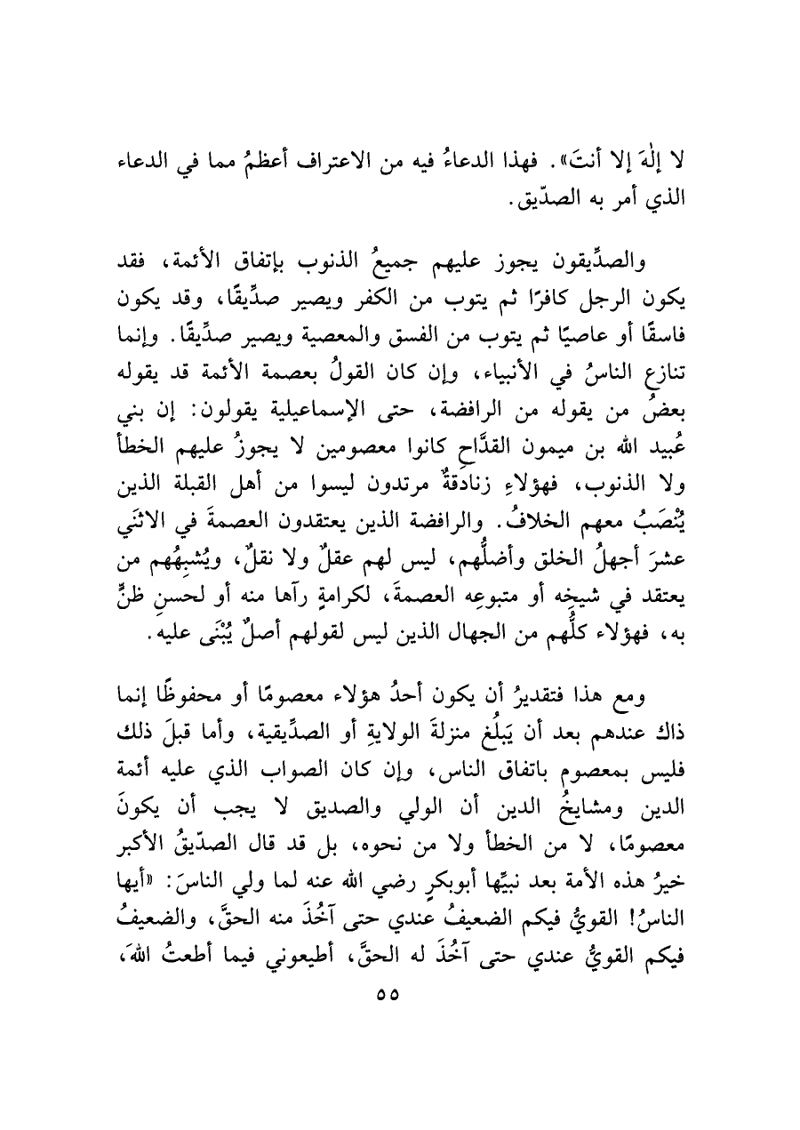 والصدِّيقون يجوز عليهم جميعُ الذنوب بإتفاق الأئمة، فقد يكون الرجل كافرًا ثم يتوب من الكفر ويصير صدِّيقًا، وقد يكون فاسقًا أو عاصيًا ثم يتوب من الفسق والمعصية ويصير صدِّيقًا. وإنما تنازع الناسُ في الأنبياء، وإن كان القولُ بعصمة الأئمة قد يقوله بعضُ من يقوله من الرافضة، حتى الإسماعيلية يقولون: إن بني عُبيد الله بن ميمون القدَّاحِ كانوا معصومين لا يجوزُ عليهم الخطأ ولا الذنوب، فهؤلاءِ زنادقةٌ مرتدون ليسوا من أهل القبلة الذين يُنْصَبُ معهم الخلافُ. والرافضة الذين يعتقدون العصمةَ في الاثنَي عشرَ أجهلُ الخلق وأضلُّهم، ليس لهم عقل ولا نقل، ويُشبِهُهم من يعتقد في شيخِه أو متبوعِه العصمةَ، لكرامة رآها منه أو لحسنِ ظنٍّ به، فهؤلاء كلُّهم من الجهال الذين ليس لقولهم أصل يُبْنَى عليه.