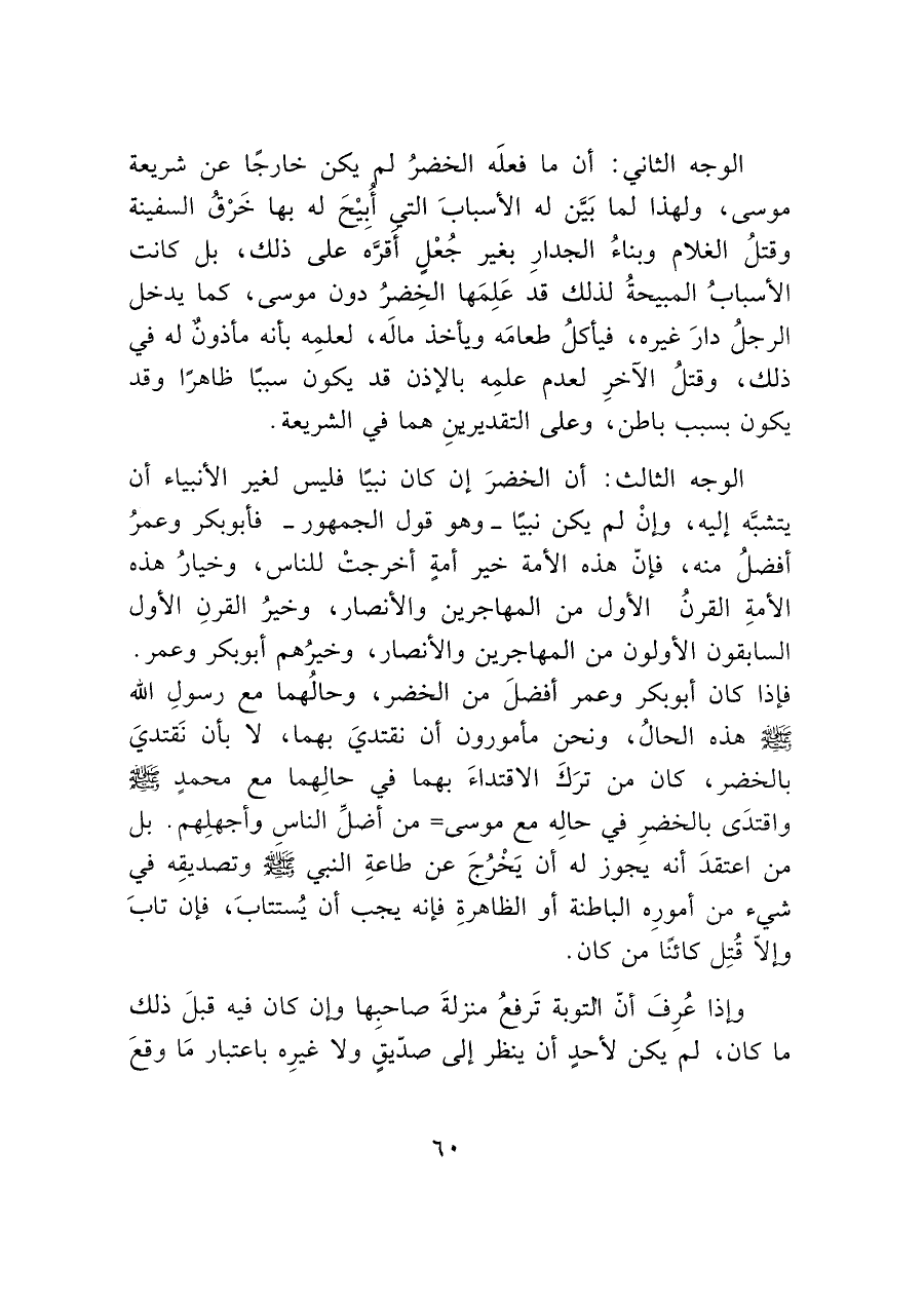 الوجه الثالث: أن الخضرَ إن كان نبيًا فليس لغير الأنبياء أن يتشبَّه إليه، وإنْ لم يكن نبيًا - وهو قول الجمهور - فأبو بكر وعمرُ أفضلُ منه، فإنّ هذه الأمة خير أمةٍ أخرجتْ للناس، وخيارُ هذه الأمةِ القرنُ الأول من المهاجرين والأنصار، وخيرُ القرنِ الأول السابقون الأولون من المهاجرين والأنصار، وخيرُهم أبو بكر وعمر.