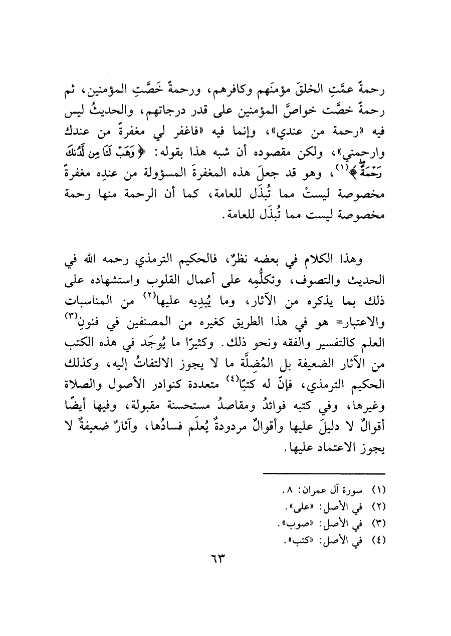 وهذا الكلام في بعضه نظرٌ، فالحكيم الترمذي رحمه الله في الحديث والتصوف، وتكلُّمِه على أعمال القلوب واستشهاده على ذلك بما يذكره من الآثار، وما يُبدِيه عليها (¬٢) من المناسبات والاعتبار= هو في هذا الطريق كغيره من المصنفين في فنونِ (¬٣) العلم كالتفسير والفقه ونحو ذلك. وكثيرًا ما يُوجَد في هذه الكتب من الآثار الضعيفة بل المُضِلَّة ما لا يجوز الالتفاتُ إليه، وكذلك الحكيم الترمذي، فإن له كتبًا (¬٤) متعددة كنوادر الأصول والصلاة وغيرها، وفي كتبه فوائدُ ومقاصدُ مستحسنة مقبولة، وفيها أيضًا أقوالٌ لا دليلَ عليها وأقوالٌ مردودة يُعلَم فسادُها، وآثارٌ ضعيفةٌ لا يجوز الاعتماد عليها.