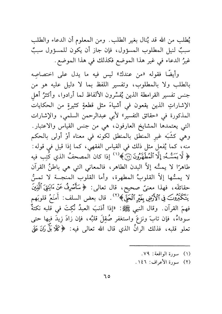 وأيضًا فقوله "من عندك" ليس فيه ما يدل على اختصاصِه بالطلب ولا بالمطلوب، وتفسير اللفظ بما لا دليل عليه هو من جنس تفسير القرامطة الذين يُفسِّرون الألفاظ لما أرادوا، وأكثرُ أهلِ الإشاراتِ الذين يقعون في أشياءَ مثل قطعةِ كثيرةٍ من الحكايات المذكورة في "حقائق التفسير" لأبي عبد الرحمن السلمي، والإشارات التي يعتمدها المشايخ العارفون، هي من جنس القياس والاعتبار.