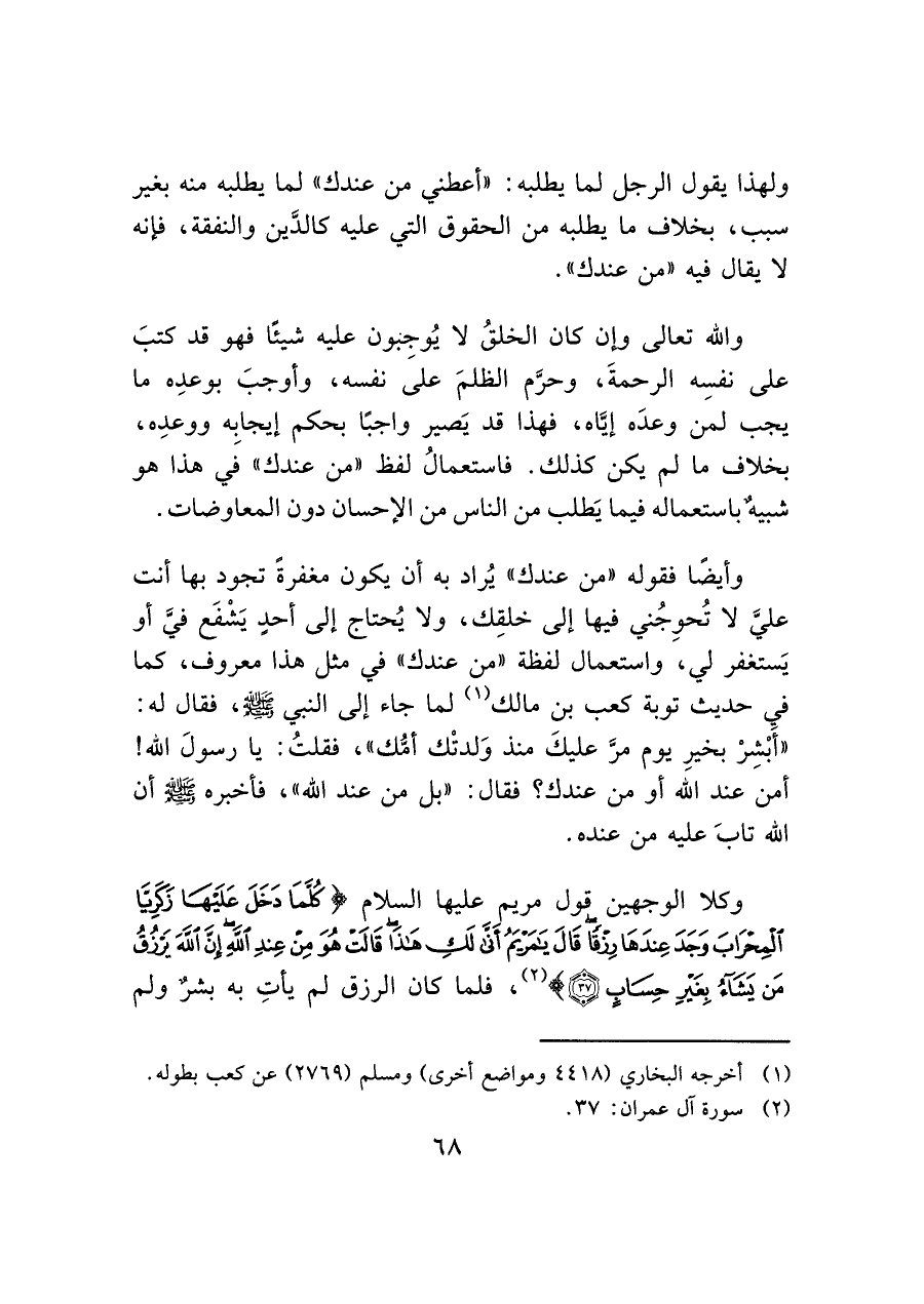 والله تعالى وإن كان الخلقُ لا يُوجبون عليه شيئًا فهو قد كتبَ على نفسِه الرحمةَ، وحرَّم الظلمَ علىَ نفسه، وأوجبَ بوعدِه ما يجب لمن وعدَه إيَّاه، فهذا قد يَصير واجبًا بحكم إيجابِه ووعدِه، بخلاف ما لم يكن كذلك. فاستعمالُ لفظ "من عندك" في هذا هو شبيهٌ باستعماله فيما يَطلب من الناس من الإحسان ذو المعاوضات.