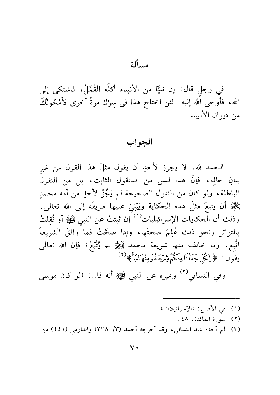 في رجلٍ قال: إن نبيًّا من الأنبياء أكلَه القُمَّلُ، فاشتكى إلى الله، فأوحى الله إليه: لئن اختلجَ هذا في سِرِّك مرةً أخرى لأمْحُونَّكَ من ديوان الأنبياء.