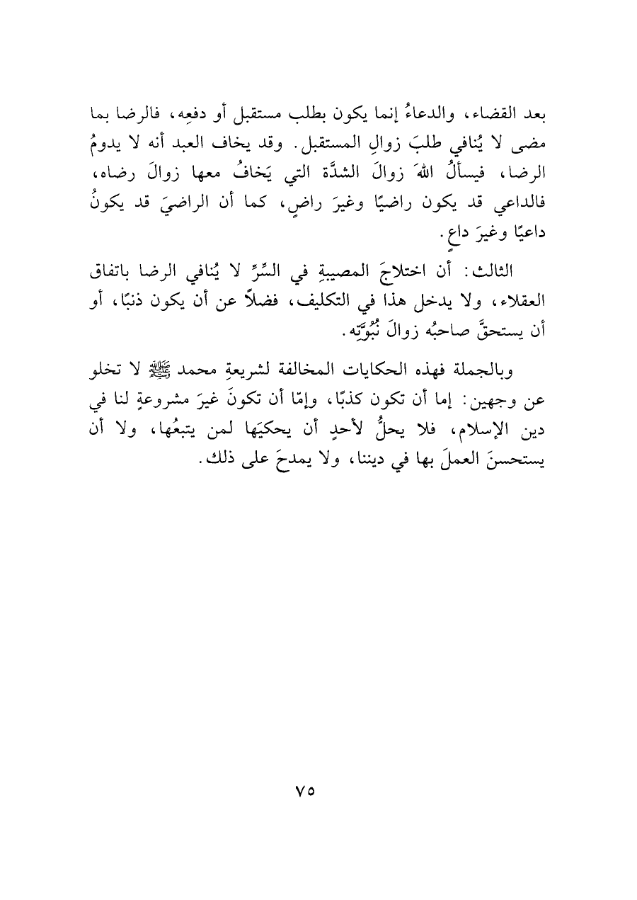 الثالث: أن اختلاجَ المصيبةِ في السر لا يُنافي الرضا باتفاق العقلاء، ولا يدخل هذا في التكليف، فضلاً عن أن يكون ذنبًا، أو أن يستحق صاحبُه زوالَ نبوته.