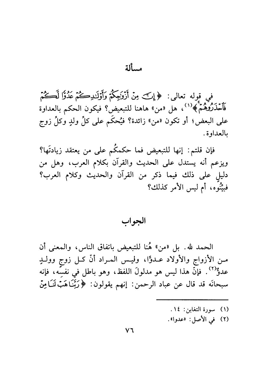 الحمد لله. بل "من" هُنا للتبعيض باتفاق الناس، والمعنى أن من الأزواج والأولاد عدوًّا، وليس المراد أنّ كل زوجٍ وولدٍ عدوٌّ (¬٢). فإنّ هذا ليس هو مدلولَ اللفظ، وهو باطل في نفسِه، فإن سبحانَه قد قال عن عباد الرحمن: إنهم يقولون: (رَبَّنَا هَبْ لَنَا مِنْ