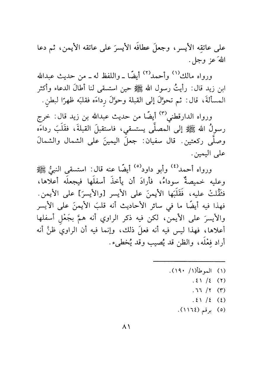 ورواه مالك (¬١) وأحمد (¬٢) أيضًا - واللفظ له - من حديث عبد الله ابن زيد قال: رأيتُ رسول الله - صَلَّى اللَّهُ عَلَيْهِ وَسَلَّمَ - حين استسقى لنا أطالَ الدعاء وأكثر المسألةَ، قال: ثم تحوَّلَ إلى القبلة وحوَّلَ رِداءَه فقلبَه ظهرًا لبطنٍ.