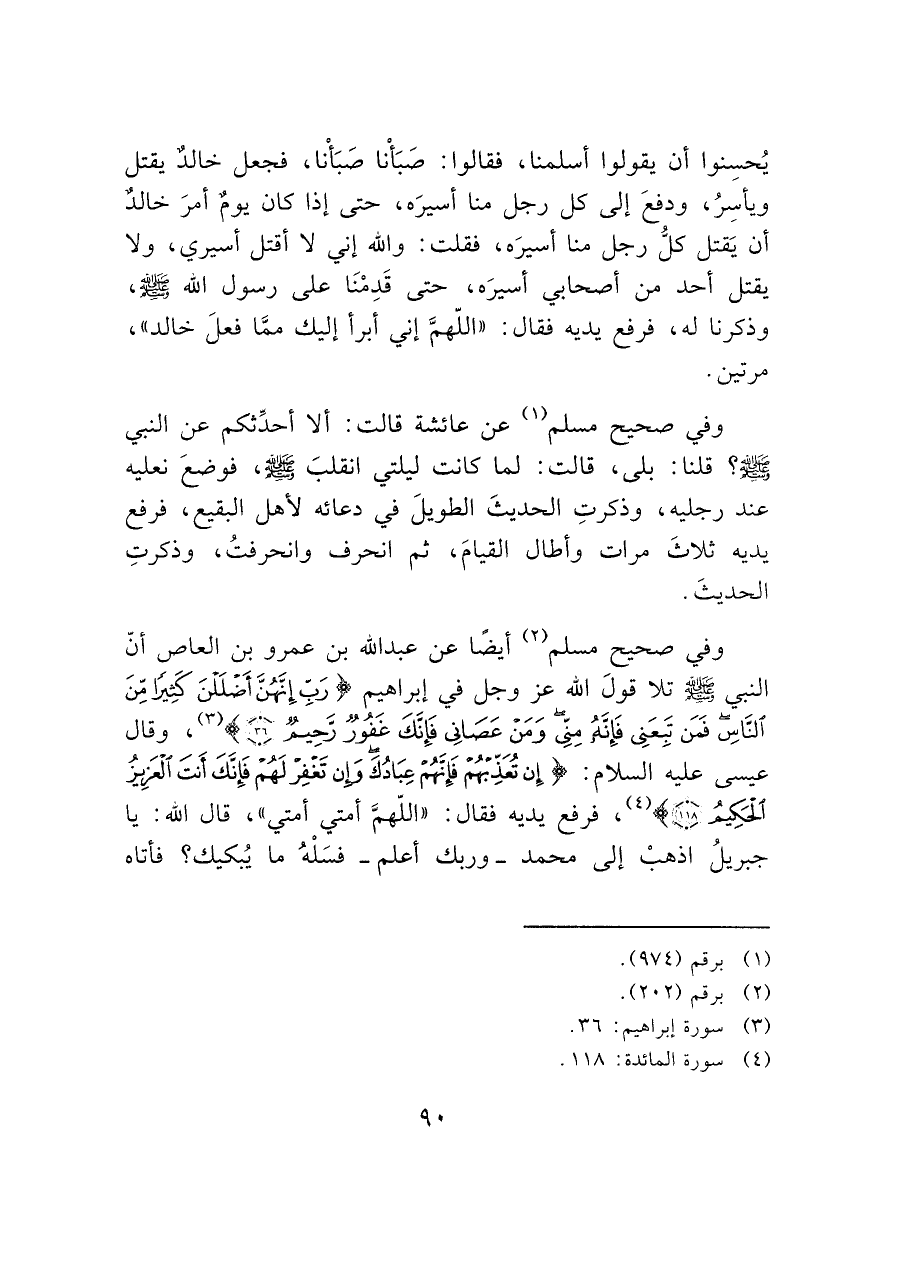 وفي صحيح مسلم (¬٢) أيضا عن عبد الله بن عمرو بن العاص أنّ النبي - صَلَّى اللَّهُ عَلَيْهِ وَسَلَّمَ - تلا قولَ الله عز وجل في إبراهيم (رَبِّ إِنَّهُنَّ أَضْلَلْنَ كَثِيراً مِنَ النَّاسِ فَمَنْ تَبِعَنِي فَإِنَّهُ مِنِّي وَمَنْ عَصَانِي فَإِنَّكَ غَفُورٌ رَحِيمٌ (٣٦)) (¬٣)، وقال عيسى عليه السلام: (إِنْ تُعَذِّبْهُمْ فَإِنَّهُمْ عِبَادُكَ وَإِنْ تَغْفِرْ لَهُمْ فَإِنَّكَ أَنْتَ الْعَزِيزُ الْحَكِيمُ (١١٨)) (¬٤)، فرفع يديه فقال: "اللهمَّ أمتي أمتي"، قال الله: يا جبريلُ اذهبْ إلى محمد - وربك أعلم - فسَلْهُ ما يُبكيك؟ فأتاه
