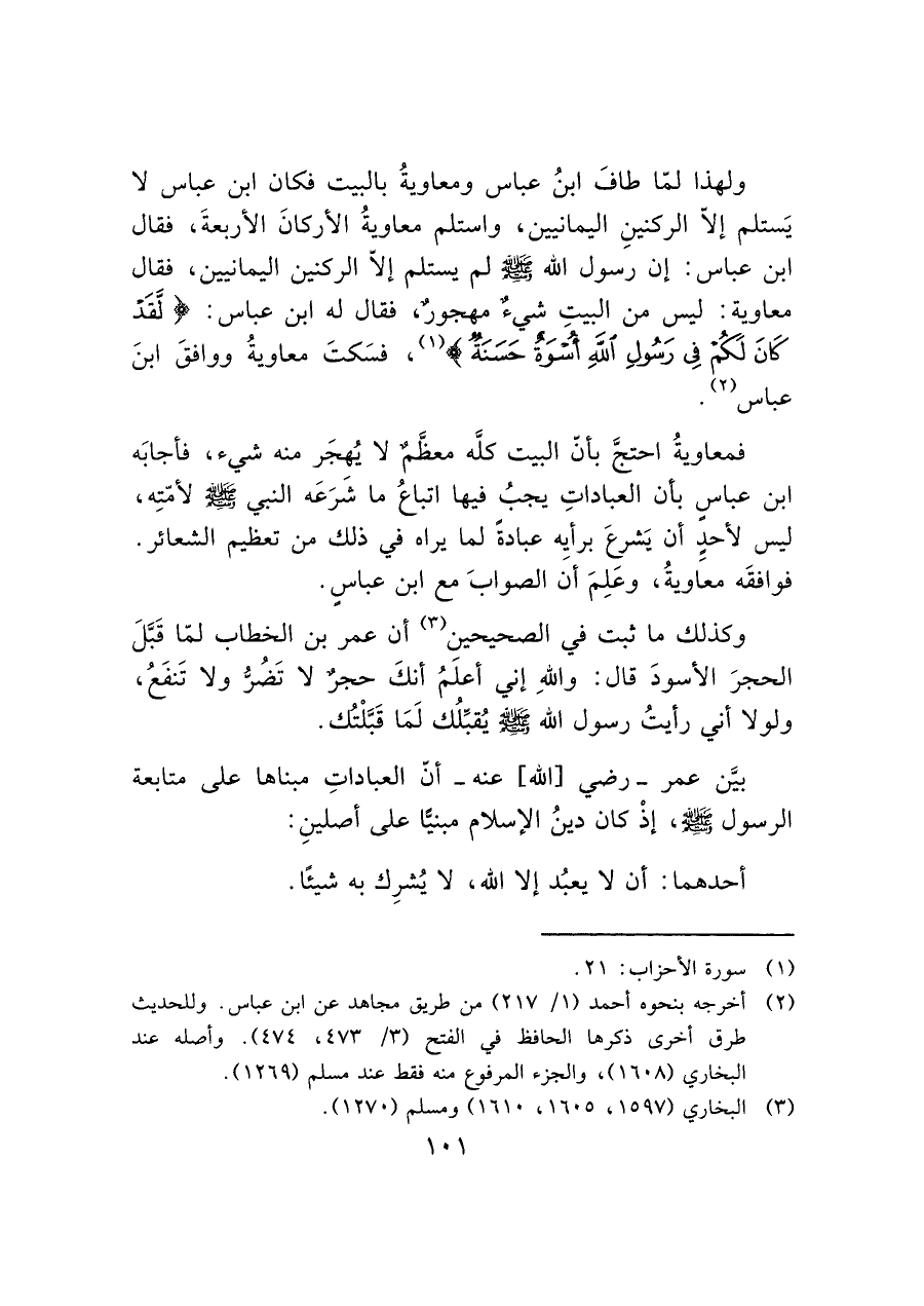 ولهذا لمّا طافَ ابنُ عباس ومعاويةُ بالبيت فكان ابن عباس لا يَستلم إلاّ الركنينِ اليمانيين، واستلم معاويةُ الأركانَ الأربعةَ، فقال ابن عباس: إن رسول الله - صَلَّى اللَّهُ عَلَيْهِ وَسَلَّمَ - لم يستلم إلاّ الركنين اليمانيين، فقال معاوية: ليس من البيتِ شيء مهجور، فقال له ابن عباس: (لَقَدْ كَانَ لَكُمْ فِي رَسُولِ اللَّهِ أُسْوَةٌ حَسَنَةٌ) (¬١)، فسَكتَ معاويةُ ووافقَ ابنَ عباس (¬٢).