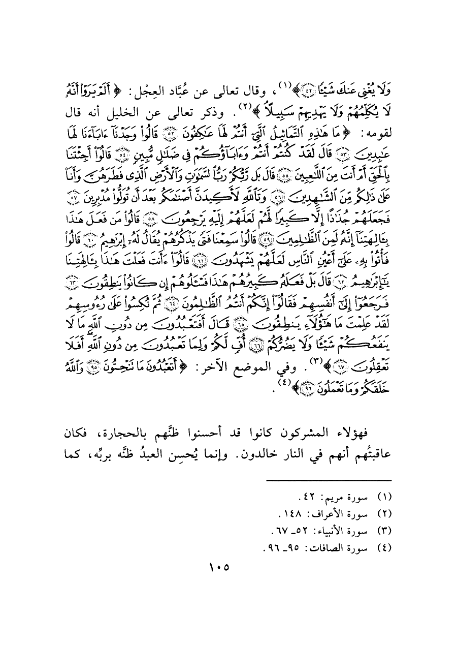 وَلَا يُغْنِي عَنْكَ شيئًا (٤٢)) (¬١)، وقال تعالى عن عُبَّاد العِجْل: (أَلَمْ يَرَوْا أَنَّهُ لَا يُكَلِّمُهُمْ وَلَا يَهْدِيهِمْ سَبِيلًا) (¬٢). وذكر تعالى عن الخليل أنه قال لقومه: (مَا هَذِهِ التَّمَاثِيلُ الَّتِي أَنْتُمْ لَهَا عَاكِفُونَ (٥٢) قَالُوا وَجَدْنَا آَبَاءَنَا لَهَا عَابِدِينَ (٥٣) قَالَ لَقَدْ كُنْتُمْ أَنْتُمْ وَآَبَاؤُكُمْ فِي ضَلَالٍ مُبِينٍ (٥٤) قَالُوا أَجِئْتَنَا بِالْحَقِّ أَمْ أَنْتَ مِنَ اللَّاعِبِينَ (٥٥) قَالَ بَلْ رَبُّكُمْ رَبُّ السَّمَاوَاتِ وَالْأَرْضِ الَّذِي فَطَرَهُنَّ وَأَنَا عَلَى ذَلِكُمْ مِنَ الشَّاهِدِينَ (٥٦) وَتَاللَّهِ لَأَكِيدَنَّ أَصْنَامَكُمْ بَعْدَ أَنْ تُوَلُّوا مُدْبِرِينَ (٥٧) فَجَعَلَهُمْ جُذَاذًا إِلَّا كَبِيرًا لَهُمْ لَعَلَّهُمْ إِلَيْهِ يَرْجِعُونَ (٥٨) قَالُوا مَنْ فَعَلَ هَذَا بِآَلِهَتِنَا إِنَّهُ لَمِنَ الظَّالِمِينَ (٥٩) قَالُوا سَمِعْنَا فَتًى يَذْكُرُهُمْ يُقَالُ لَهُ إِبْرَاهِيمُ (٦٠) قَالُوا فَأْتُوا بِهِ عَلَى أَعْيُنِ النَّاسِ لَعَلَّهُمْ يَشْهَدُونَ (٦١) قَالُوا أَأَنْتَ فَعَلْتَ هَذَا بِآَلِهَتِنَا يَا إِبْرَاهِيمُ (٦٢) قَالَ بَلْ فَعَلَهُ كَبِيرُهُمْ هَذَا فَاسْأَلُوهُمْ إِنْ كَانُوا يَنْطِقُونَ (٦٣) فَرَجَعُوا إِلَى أَنْفُسِهِمْ فَقَالُوا إِنَّكُمْ أَنْتُمُ الظَّالِمُونَ (٦٤) ثُمَّ نُكِسُوا عَلَى رُءُوسِهِمْ لَقَدْ عَلِمْتَ مَا هَؤُلَاءِ يَنْطِقُونَ (٦٥) قَالَ أَفَتَعْبُدُونَ مِنْ دُونِ اللَّهِ مَا لَا يَنْفَعُكُمْ شيئًا وَلَا يَضُرُّكُمْ (٦٦) أُفٍّ لَكُمْ وَلِمَا تَعْبُدُونَ مِنْ دُونِ اللَّهِ أَفَلَا تَعْقِلُونَ (٦٧)) (¬٣). وفي الموضع الآخر: (أَتَعْبُدُونَ مَا تَنْحِتُونَ (٩٥) وَاللَّهُ خَلَقَكُمْ وَمَا تَعْمَلُونَ (٩٦)) (¬٤).
