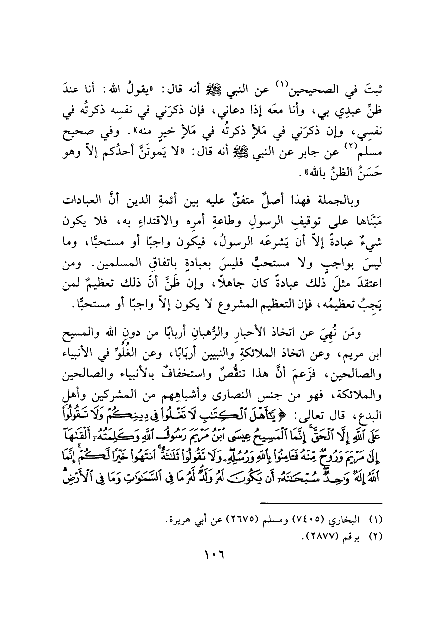 ومَن نُهِيَ عن اتخاذ الأحبارِ والرُّهبانِ أربابًا من دونِ الله والمسيح ابن مريم، وعن اتخاذ الملائكةِ والنبيين أربَابًا، وعن الغُلُوِّ في الأنبياء والصالحين، فزَعمَ أنَّ هذا تنقُّصٌ واستخفافٌ بالأنبياء والصالحين والملائكة، فهو من جنس النصارى وأشباهِهم من المشركين وأهلِ البدع، قال تعالى: (يَا أَهْلَ الْكِتَابِ لَا تَغْلُوا فِي دِينِكُمْ وَلَا تَقُولُوا عَلَى اللَّهِ إِلَّا الْحَقَّ إِنَّمَا الْمَسِيحُ عِيسَى ابْنُ مَرْيَمَ رَسُولُ اللَّهِ وَكَلِمَتُهُ أَلْقَاهَا إِلَى مَرْيَمَ وَرُوحٌ مِنْهُ فَآَمِنُوا بِاللَّهِ وَرُسُلِهِ وَلَا تَقُولُوا ثَلَاثَةٌ انْتَهُوا خَيْرًا لَكُمْ إِنَّمَا اللَّهُ إِلَهٌ وَاحِدٌ سُبْحَانَهُ أَنْ يَكُونَ لَهُ وَلَدٌ لَهُ مَا فِي السَّمَاوَاتِ وَمَا فِي الْأَرْضِ