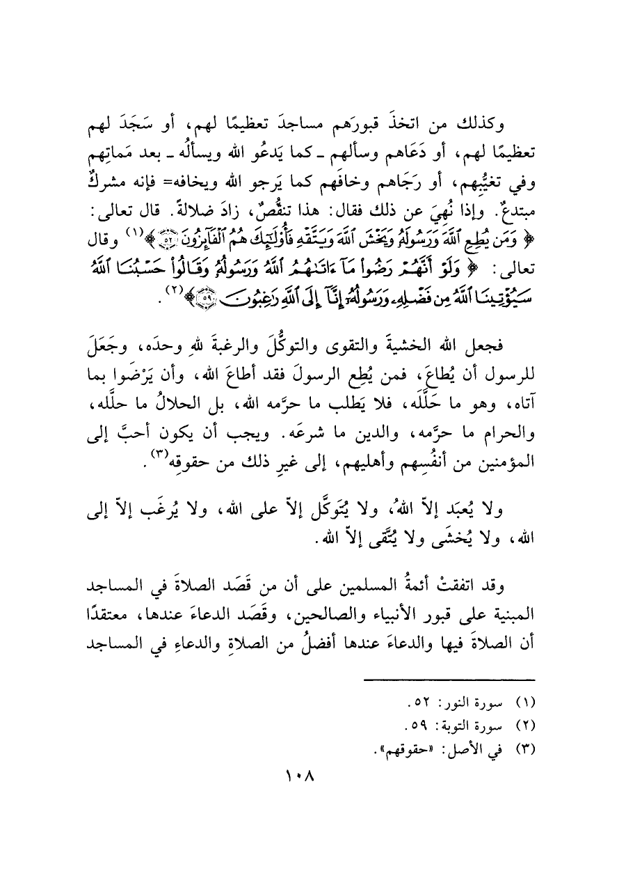 وكذلك من اتخذَ قبورَهم مساجدَ تعظيمًا لهم، أو سَجَدَ لهم تعظيمًا لهم، أو دَعَاهم وسألهِم -كما يَدعُو الله ويسألُه- بعد مَماتِهم وفي تغيّبِهم، أو رَجَاهم وخافهم كما يَرجو الله ويخافه= فإنه مشركٌ مبتدع. وإذا نُهِيَ عن ذلك فقال: هذا تنقُّصٌ، زادَ ضلالةً، قال تعالى: (وَمَنْ يُطِعِ اللَّهَ وَرَسُولَهُ وَيَخْشَ اللَّهَ وَيَتَّقْهِ فَأُولَئِكَ هُمُ الْفَائِزُونَ (٥٢)) (¬١) وقال تعالى: (وَلَوْ أَنَّهُمْ رَضُوا مَا آَتَاهُمُ اللَّهُ وَرَسُولُهُ وَقَالُوا حَسْبُنَا اللَّهُ سَيُؤْتِينَا اللَّهُ مِنْ فَضْلِهِ وَرَسُولُهُ إِنَّا إِلَى اللَّهِ رَاغِبُونَ (٥٩)) (¬٢).