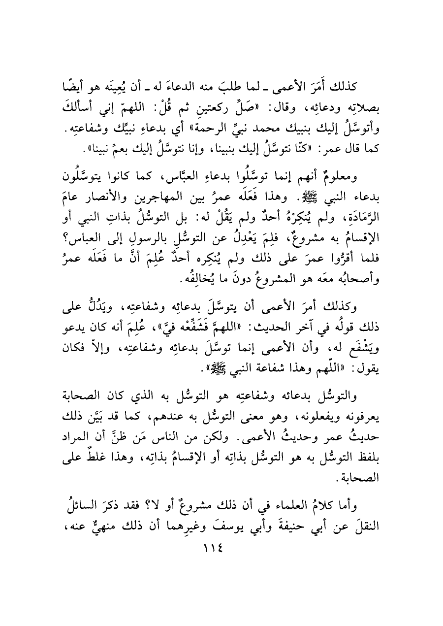 كذلك أَمَرَ الأعمى -لما طلبَ منه الدعاءَ له- أن يُعِينَه هو أيضًا بصلاتِه ودعائِه، وقال: "صَلِّ ركعتينِ ثم قُلْ: اللهمّ إني أسألكَ وأتوسَّلُ إليك بنبيك محمد نبيِّ الرحمة" أي بدعاءِ نبيِّك وشفاعتِه. كما قال عمر: "كنّا نتوسَّلُ إليك بنبينا، وإنا نتوسلُ إليك بعم نبينا".
