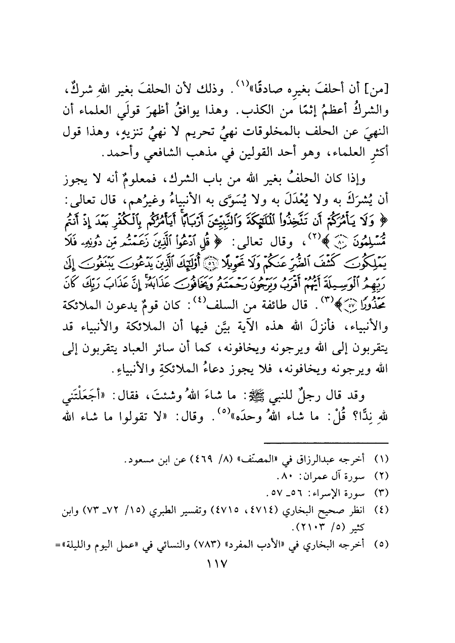 وإذا كان الحلفُ بغير الله من باب الشرك، فمعلومٌ أنه لا يجوز أن يُشرَكَ به ولا يُعْدَلَ به ولا يُسَوَّى به الأنبياءُ وغيرُهم، قال تعالى: (وَلَا يَأْمُرَكُمْ أَنْ تَتَّخِذُوا الْمَلَائِكَةَ وَالنَّبِيِّينَ أَرْبَابًا أَيَأْمُرُكُمْ بِالْكُفْرِ بَعْدَ إِذْ أَنْتُمْ مُسْلِمُونَ (٨٠)) (¬٢)، وقال تعالى: (قُلِ ادْعُوا الَّذِينَ زَعَمْتُمْ مِنْ دُونِهِ فَلَا يَمْلِكُونَ كَشْفَ الضُّرِّ عَنْكُمْ وَلَا تَحْوِيلًا (٥٦) أُولَئِكَ الَّذِينَ يَدْعُونَ يَبْتَغُونَ إِلَى رَبِّهِمُ الْوَسِيلَةَ أَيُّهُمْ أَقْرَبُ وَيَرْجُونَ رَحْمَتَهُ وَيَخَافُونَ عَذَابَهُ إِنَّ عَذَابَ رَبِّكَ كَانَ مَحْذُورًا (٥٧)) (¬٣). قال طائفة من السلف (¬٤): كان قوم يدعون الملائكة والأنبياء، فأنزلَ الله هذه الآية بيَّن فيها أن الملائكة والأنبياء قد يتقربون إلى الله ويرجونه ويخافونه، كما أن سائر العباد يتقربون إلى الله ويرجونه ويخافونه، فلا يجوز دعاءُ الملائكةِ والأنبياءِ. وقد قال رجلٌ للنبي - صَلَّى اللَّهُ عَلَيْهِ وَسَلَّمَ -: ما شاءَ الله وشئتَ، فقال: "أجَعَلْتَني لله نِدًّا؟ قُلْ: ما شاء الله وحدَه" (¬٥). وقال: "لا تقولوا ما شاء الله