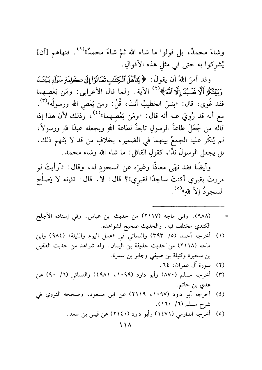 وقد أمرَ الله أن يقولَ: (يَا أَهْلَ الْكِتَابِ تَعَالَوْا إِلَى كَلِمَةٍ سَوَاءٍ بَيْنَنَا وَبَيْنَكُمْ أَلَّا نَعْبُدَ إِلَّا اللَّهَ) (¬٢) الآية. ولما قال الأعرابي: ومَن يَعْصهما فقد غَوى، قال: "بئسَ الخطيبُ أنتَ، قُلْ: ومن يَعْصِ الله ورسولَه" (¬٣).