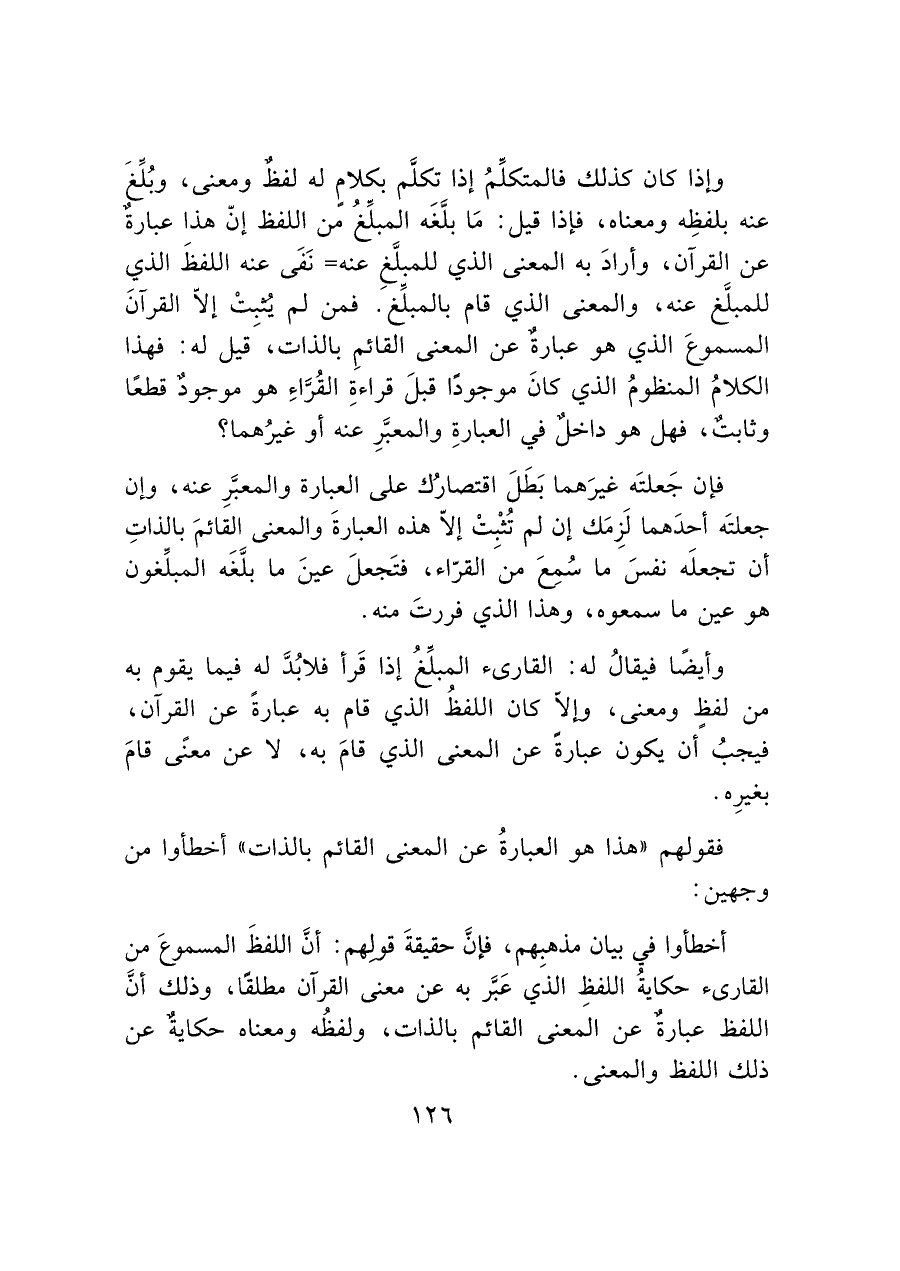 فإن جَعلتَه غيرَهما بَطَلَ اقتصارُك على العبارة والمعبرِ عنه، وإن جعلتَه أحدَهما لَزِمَك إن لم تُثْبتْ إلاّ هذه العبارةَ والمعنى القائمَ بالذاتِ أن تجعلَه نفسَ ما سُمِعَ منَ القرّاء، فتَجعلَ عينَ ما بلغَه المبلِّغون هو عين ما سمعوه، وهذا الذي فررتَ منه.