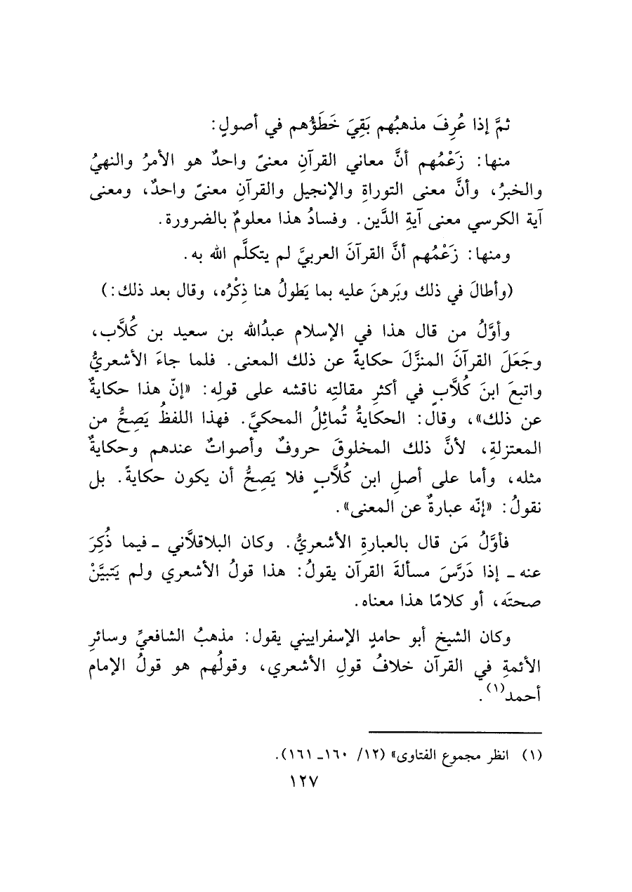 وأوَّلُ من قال هذا في الإسلام عبدُ الله بن سعيد بن كُلَاّب، وجَعَلَ القرآنَ المنزَّلَ حكايةً عن ذلك المعنى. فلما جاءَ الأشعريُّ واتبعَ ابنَ كُلَاّب في أكثرِ مقالتِه ناقشه على قوله: "إنّ هذا حكايةٌ عن ذلك"، وقالً: الحكايةُ تُماثِلُ المحكيَّ. فهذا اللفظُ يَصِحُّ من المعتزلةِ، لأنَّ ذلك المخلوقَ حروفٌ وأصواتٌ عندهم وحكايةٌ مثله، وأما على أصلِ ابن كُلَاّبٍ فلا يَصِحُّ أن يكون حكايةً. بل نقولُ: "إنّه عبارةٌ عن المعنى".