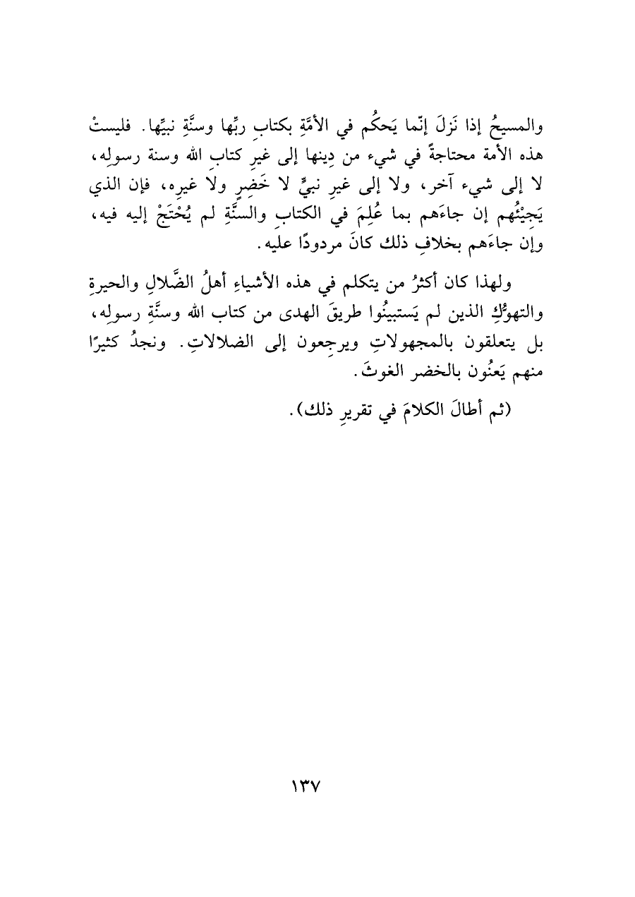 والمسيحُ إذا نَزلَ إنّما يَحكُم في الأمَّةِ بكتابِ ربِّها وسنَّةِ نبيها. فليستْ هذه الأمة محتاجةً في شيء من دِينها إلى غيرِ كتاب الله وسنة رسوله، لا إلى شيء آخر، ولا إلى غيرِ نبيٍّ لا خَضِرٍ ولَا غيرِه، فإن الذي يَجيْئُهم إن جاءَهم بما عُلِمَ في الكتاب والسنَّةِ لم يُحْتَجْ إليه فيه، وإَن جاءَهم بخلافِ ذلك كانَ مردودًا علَيه.